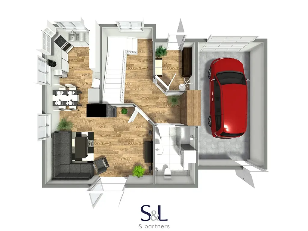 V přízemí domu se nachází zádveří, prostorná chodba a světlý obývací pokoj s krbem a propojený s kuchyňským koutem vybaveným spotřebiči. Z obývací části vedou francouzské dveře přímo do pergoly a na zahradu, což zajišťuje pohodlné propojení interiéru s venkovním prostorem. V přízemí je dále koupelna se sprchovým koutem a toaletou.