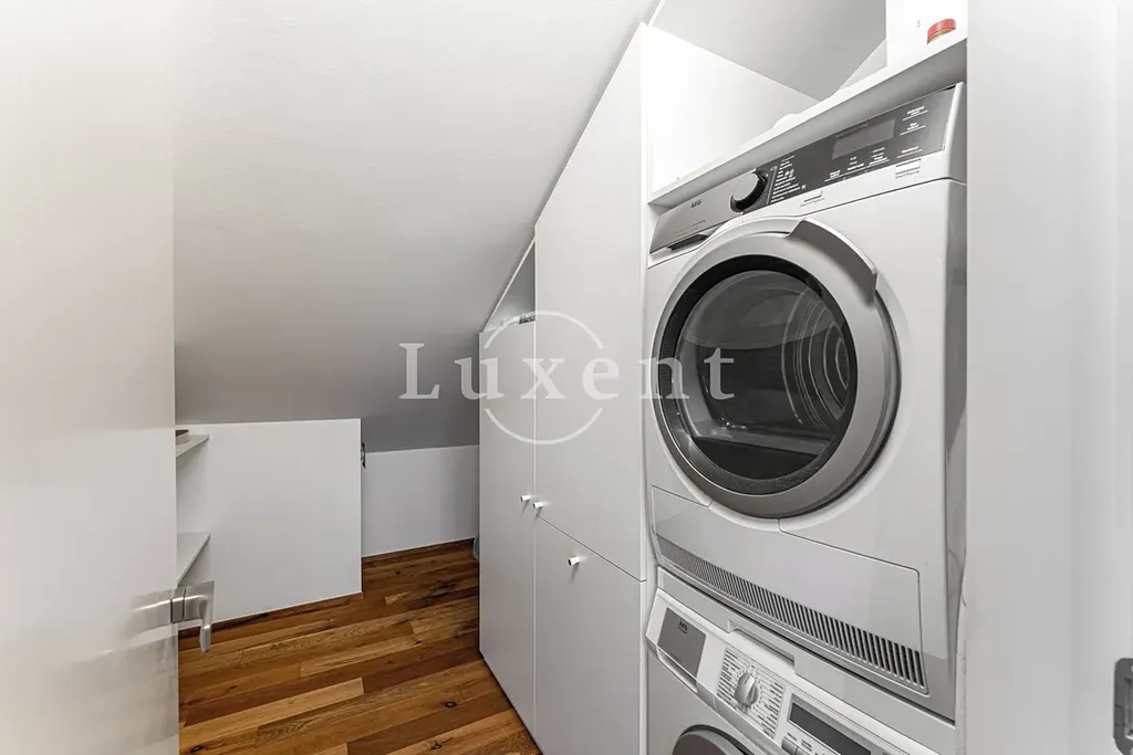 V horním patře bytu se rozkládá prostorný obývací pokoj s příjemnou terasou a otevřenými výhledy. Součástí horního patra bytu je dále plně vybavená kuchyně, jídelní část a odpočinková zóna s koženou sedací soupravou, krbem a kvalitním audio systémem a televizí. V jídelně je vinotéka a jídelní stůl se šesti židlemi. V této části bytu se rovněž nachází koupelna s oknem, walk-in sprchovým koutem a toaletou a dále samostatná komora s úložnými regály, pračkou a sušičkou.