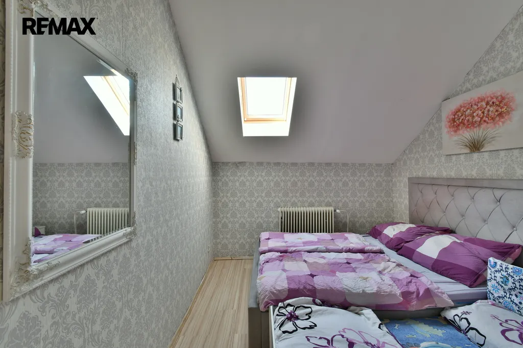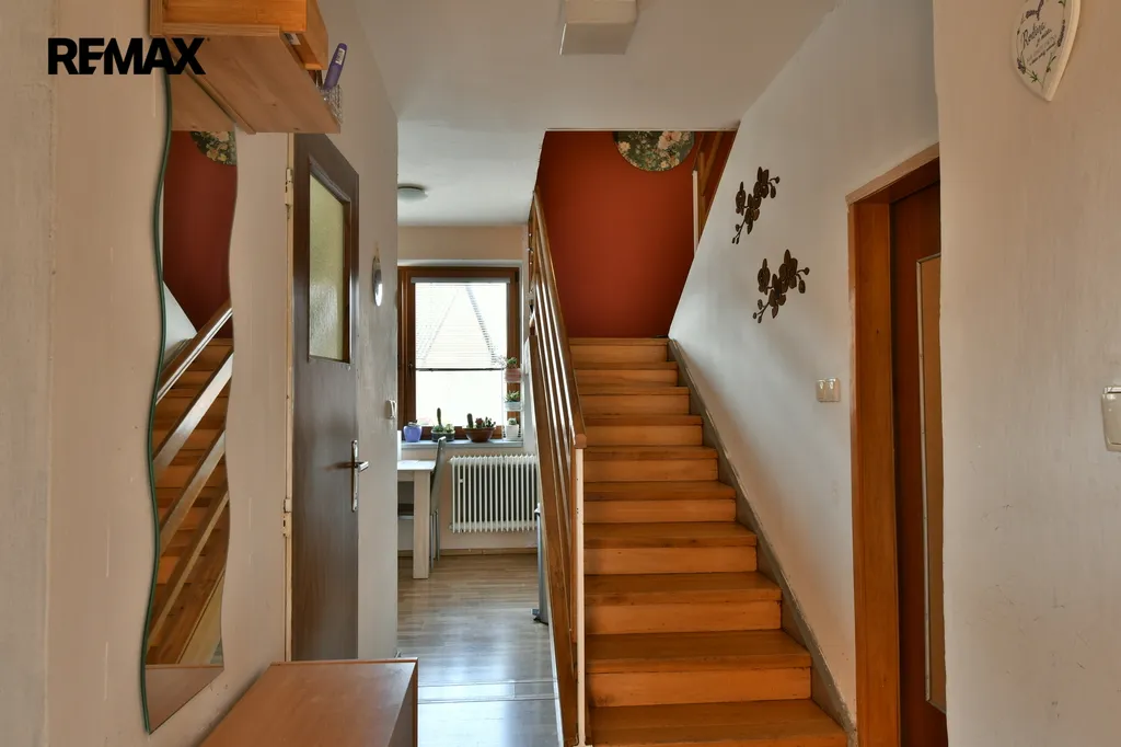 Po otevřeném schodišti se dostaneme do obytného podkroví, kde se nachází: dva samostatné pokoje, koupelna se sprchovým koutem a WC.