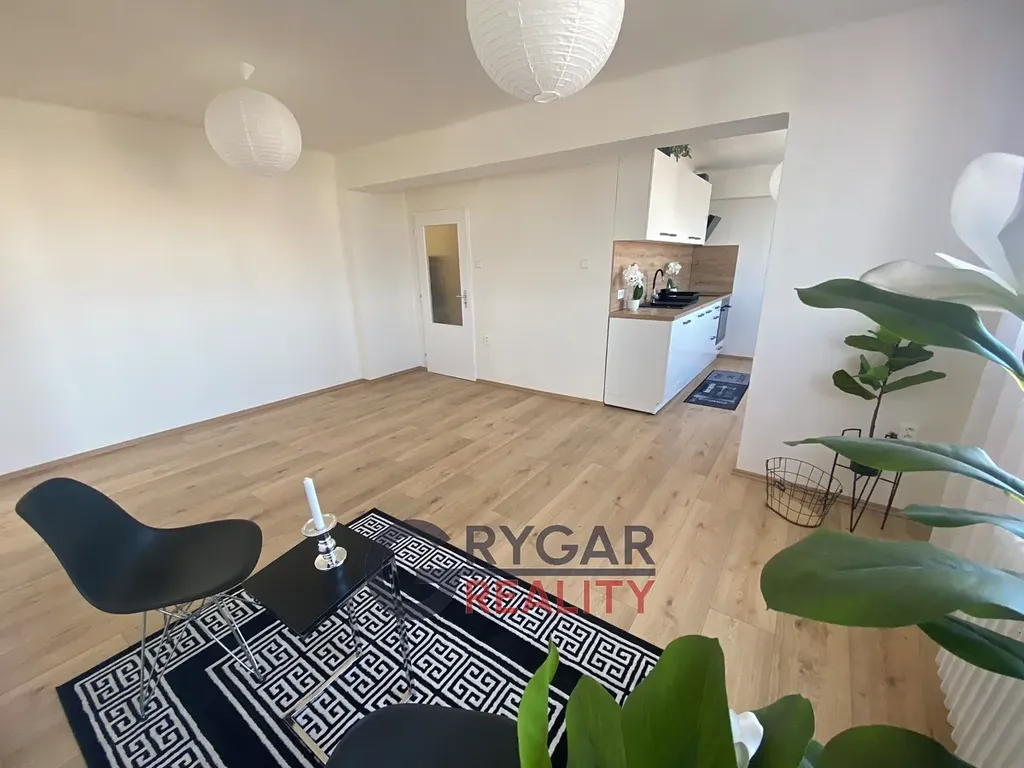 Z chodby vstupujeme do obývacího pokoje (20,44 m2) a z něho jsou 3 vstupy: vlevo do kuchyně (7,48 m2) s oknem, a novou kuchyňskou linkou v bílém provedení se zabudovanými elektrospotřebiči (myčka, indukční deska, trouba, digestoř, dřez). Z obývacího pokoje jsou vpravo vstupy do 2 ložnic (12,97 m2 a 9,47 m2). JV pokoj má vstup na balkon (2,36 m2) s nádherným výhledem do parku a vilovou čtvrť, druhý pokoj s výhledem na Brdy a Vltavu má venkovní stahovací žaluzie.
