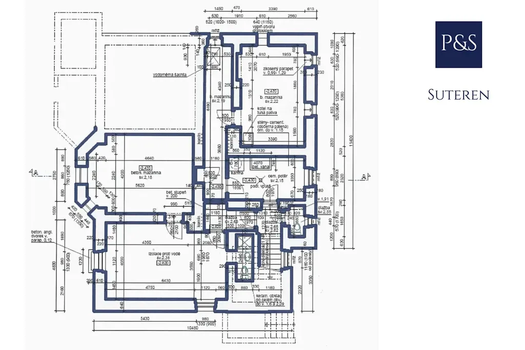 • Suterén: menší byt (např. pro správce) + technické zázemí (prádelna, sklepy).