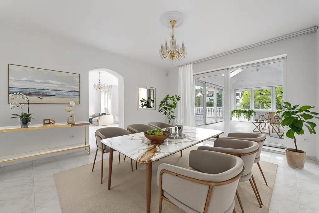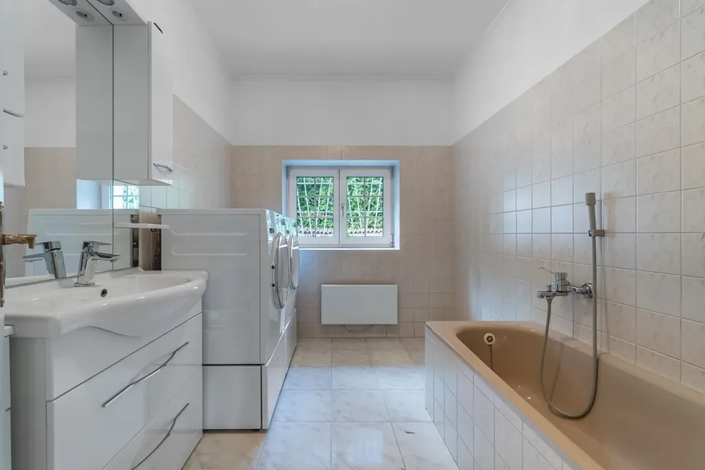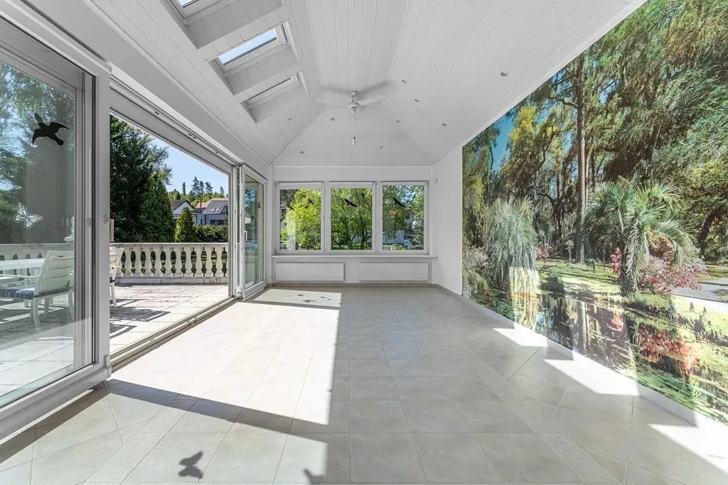 Kuchyň je vybavena vestavnými spotřebiči (trouba, sklokeramická deska, digestoř, myčka). Koupelny obsahují vanu, sprchový kout a dvě umyvadla. Zimní zahrada příjemně propojuje interiér se zahradou.