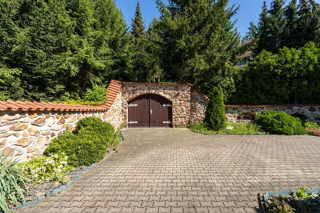 Pozemek 1 775 m² nabízí maximální soukromí. Zahradou protéká regulovaný potok, vzrostlé stromy a příjezdová cesta s ambientním osvětlením vytvářejí jedinečnou atmosféru. Garáž pro 2 vozy + parkování celkem až pro 8 automobilů.