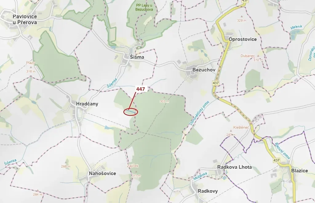 Lesní pozemek o výměře 1989 m2, parcelní číslo 447, podíl 1/1, katastrální území Hradčany na Moravě, obec Hradčany, obec s rozšířenou působností Přerov, okres Přerov, Olomoucký kraj. Po těžbě.