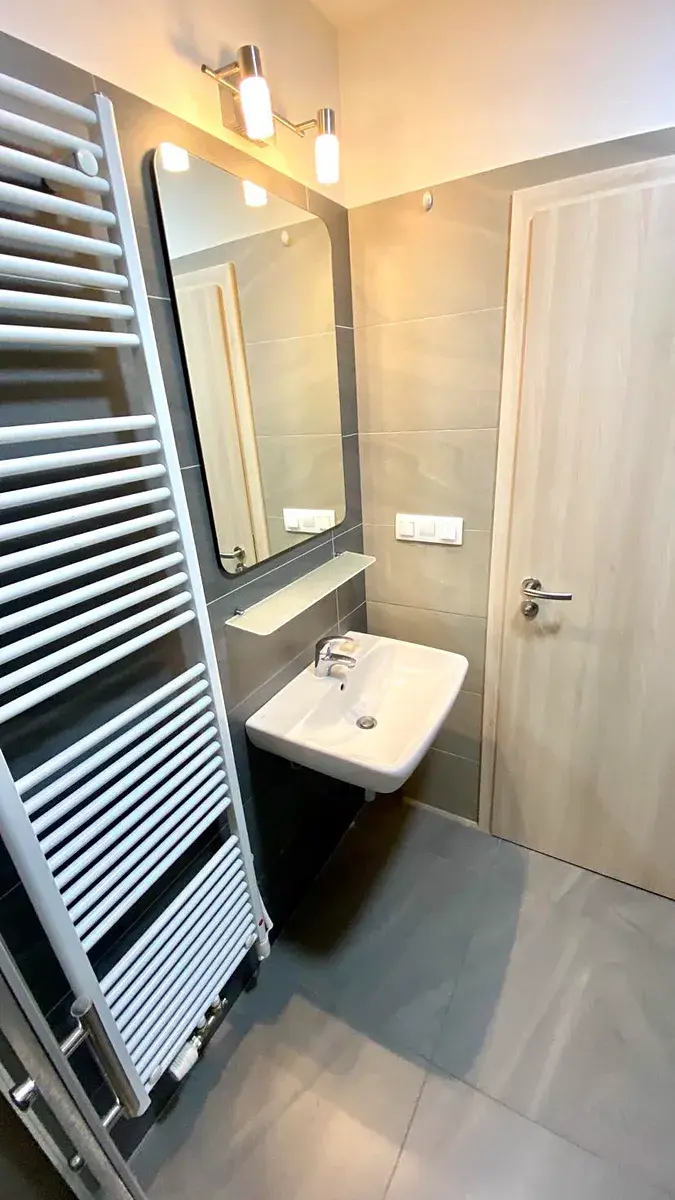 Byt je nově vybaven kuch.linkou s barpultem a 2 židlemi, značkové spotřebiče třídy A+ (sklovaná deska, el.trouba, digestoř, velká lednice s mrazákem, pračka), vybavená koupelna se sprchovým koutem, v předsíni velká vestavěná skříň, v pokoji paletová dvoj-postel (možno odstranit). K dispozici také žehlící prkno, sušák na prádlo a další 3 plastové židle.