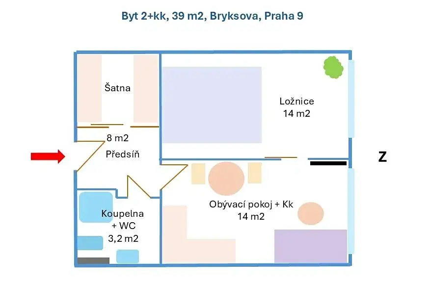 Dispozičně je byt řešen jako malý obývací pokoj spojený s kuchyňským koutem, samostatná ložnice, předsíň a koupelna spojená s toaletou.