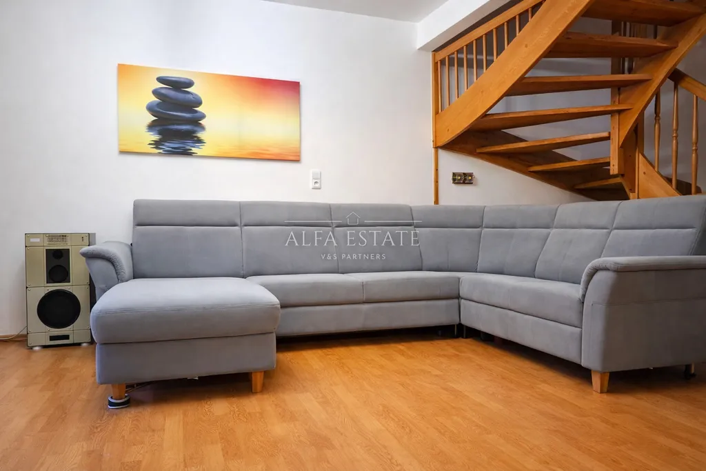 Tento světlý a vzdušný byt nabízí komfortní bydlení na dvou podlažích s dostatkem soukromí i prostoru pro rodinu či náročnější klienty.
