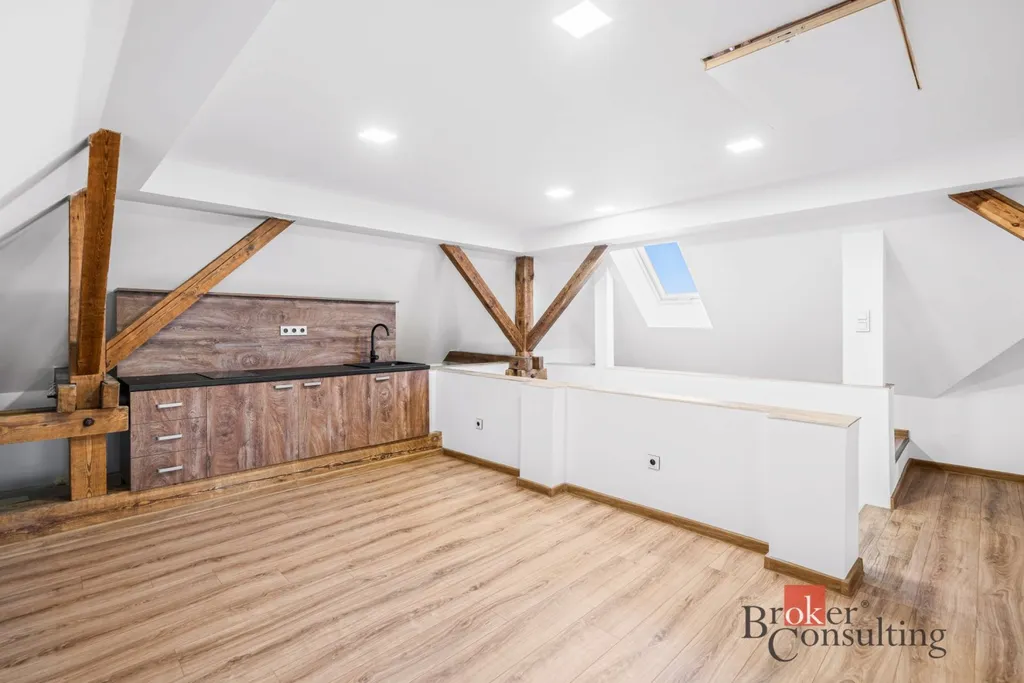 Dominantou bytu je velký obytný prostor s kuchyňským koutem, který díky vysokému stropu a střešním oknům působí velmi světlým a příjemným dojmem. Prostor je dostatečně velký na pohodlné oddělení obývací části, jídelny i spací zóny. Dřevěné trámy dodávají interiéru jedinečný charakter a vytvářejí útulnou atmosféru typickou pro podkrovní bydlení.