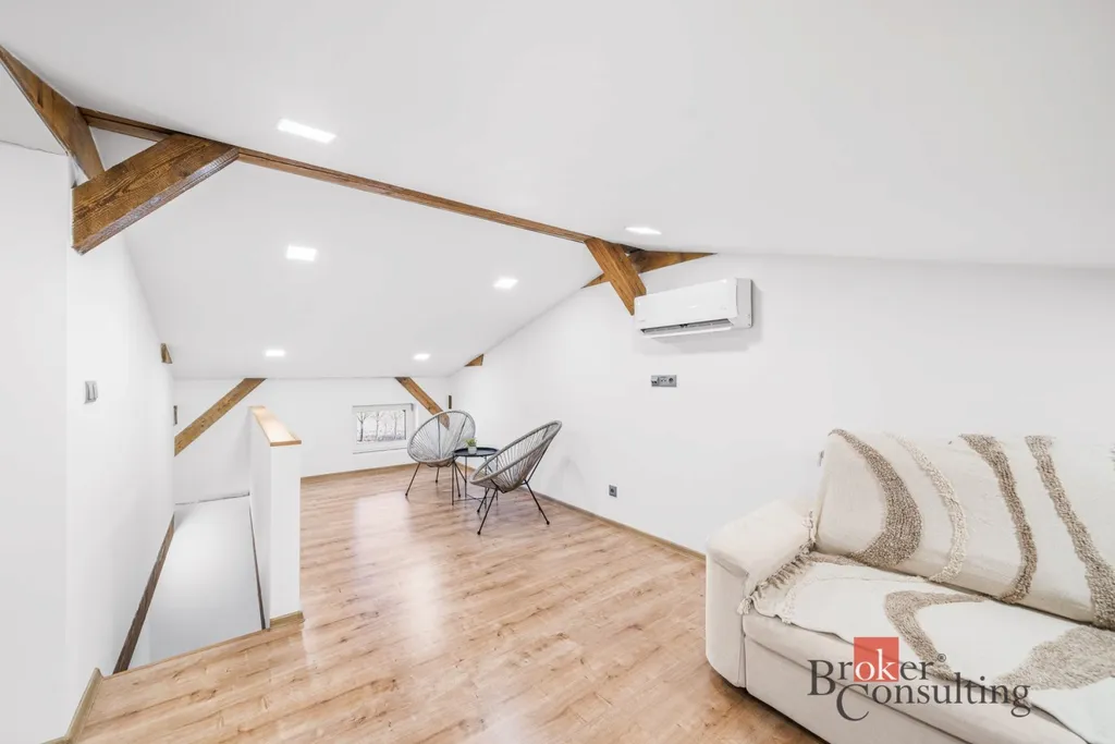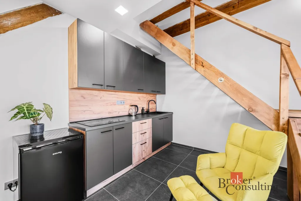 Dispozice bytu je rozložena do dvou podlaží. V přízemí se nachází kuchyňský kout s obytným prostorem a koupelna se sprchovým koutem a toaletou. Po schodech se dostanete do patra, kde je umístěna prostorná ložnice. Toto řešení přirozeně odděluje denní a klidovou část bytu a zároveň dodává prostoru vzdušnost a příjemnou atmosféru. Interiér je světlý, moderní a doplněný o dřevěné prvky, které vytvářejí útulný dojem.