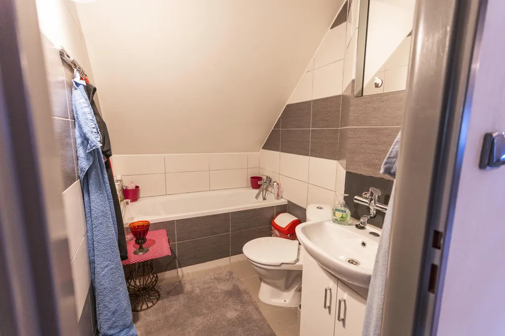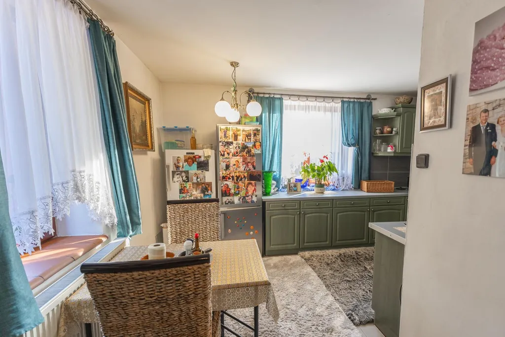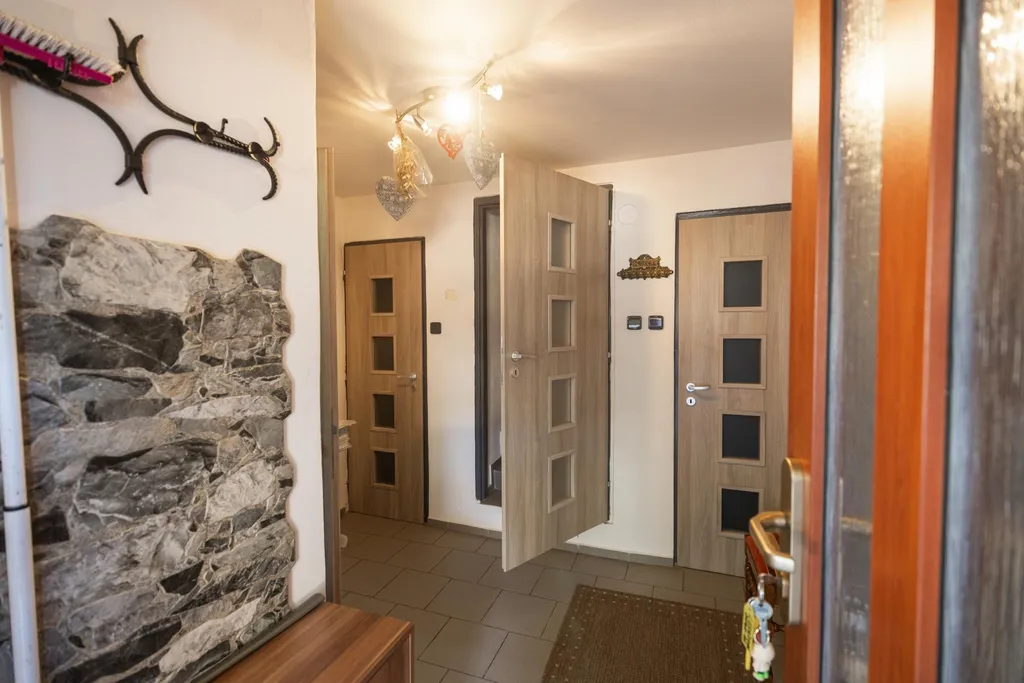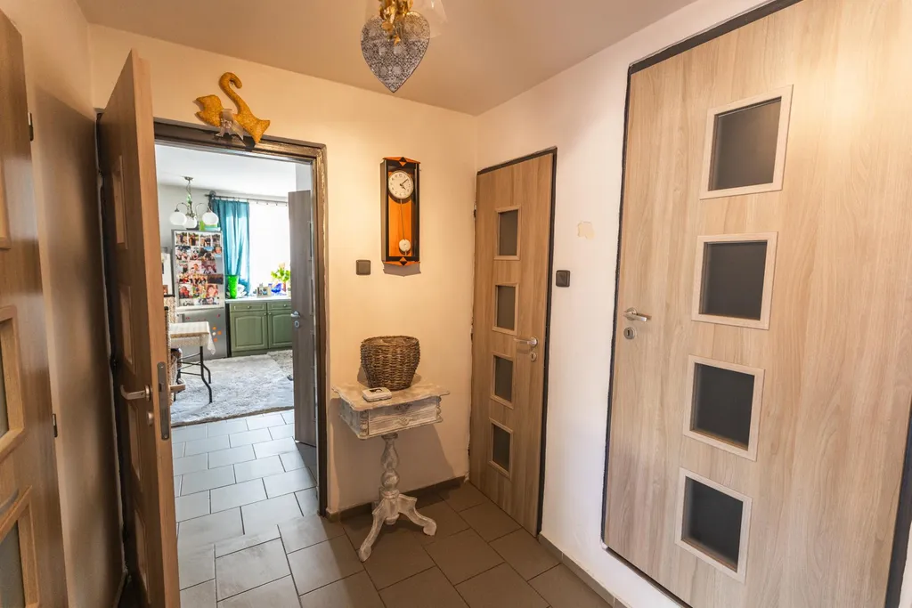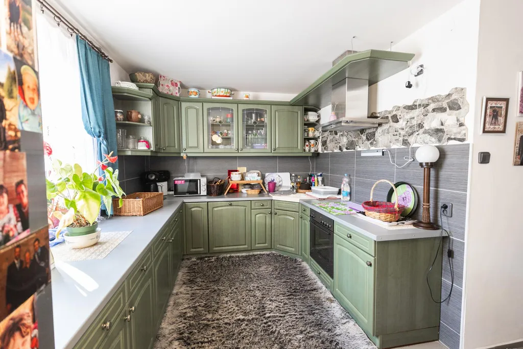 V přízemí domu najdete prostornou kuchyň s kompletní kuchyňskou linkou se všemi spotřebiči a obývací pokoj s krbem, který vytváří příjemnou atmosféru. Součástí přízemí je koupelna, samostatné WC, technická místnost a přístup do sklepa. Podkroví domu tvoří velká vstupní místnost, dva samostatné pokoje vhodné jako ložnice či dětské pokoje a další koupelna s WC. Střešní okna v pokojích zajišťují dostatek denního světla a dodávají podkroví vzdušnou a světlou atmosféru. Téměř vše z interiéru současný majitel ponechá v ceně nemovitosti budoucímu kupci.