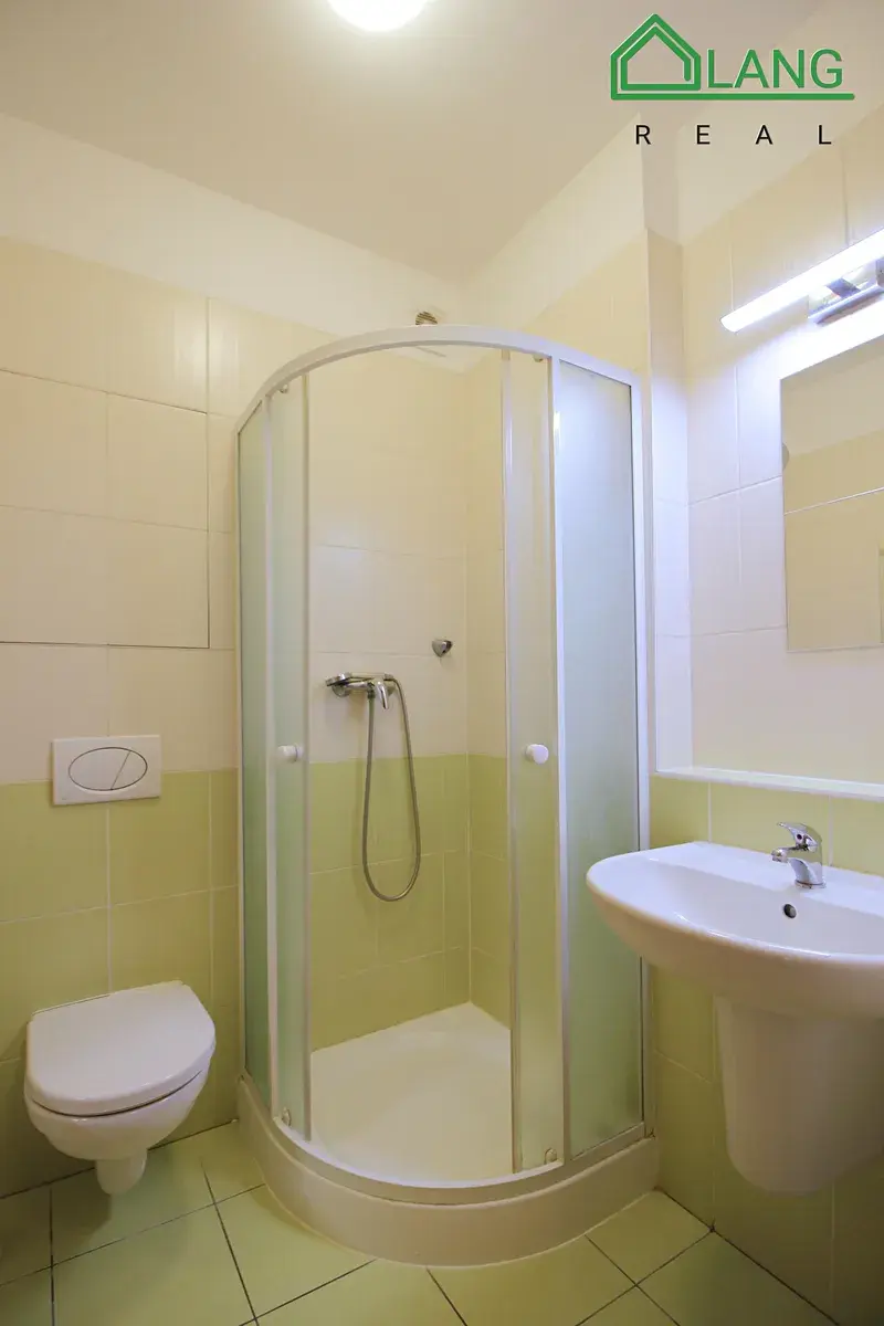 V koupelně je sprchový kout, umyvadlo a toaleta.