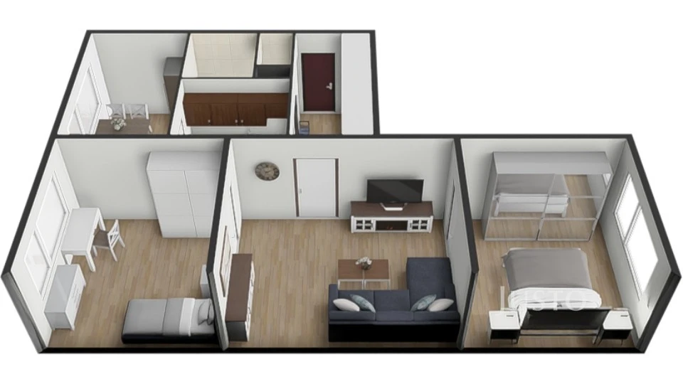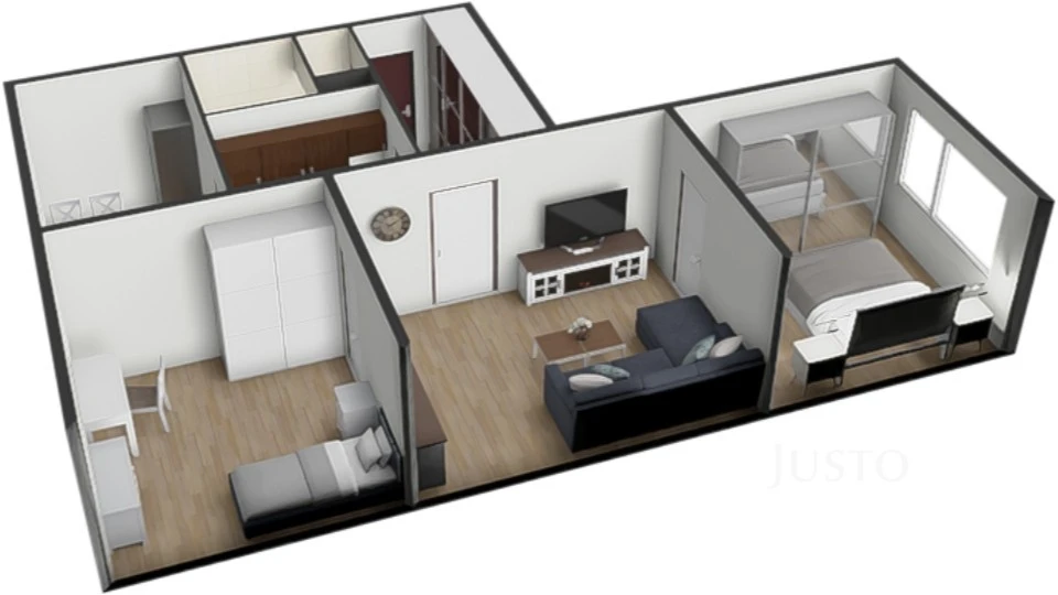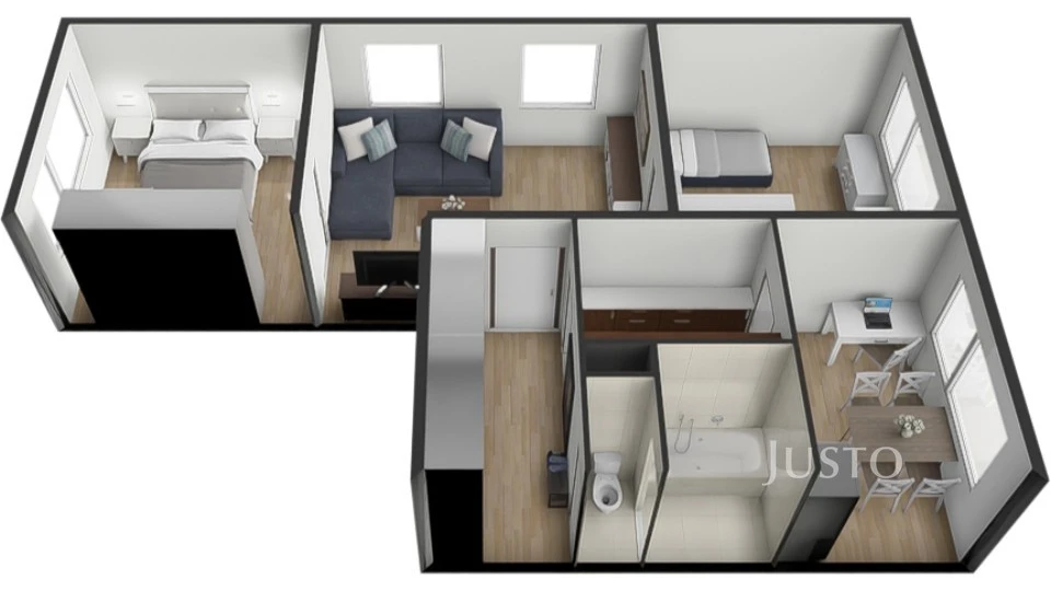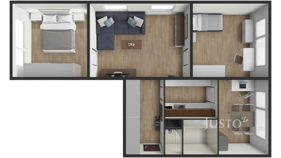 Výhodou je variabilita dispozice – vedle kuchyně se nachází menší místnost, kterou lze využít jako jídelnu, pracovnu nebo pokoj pro home office. Zároveň je zde možnost rozšíření kuchyně a vytvoření většího obytného prostoru.