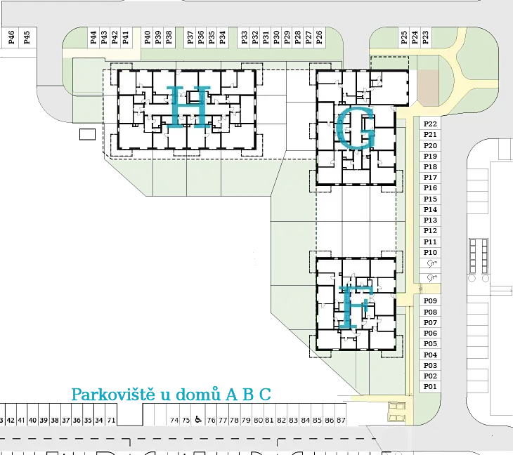 V domě budou k dispozici také sklepní kóje poskytující další úložný prostor, k dokoupení samostatně. Standardem je možnost výběru vnitřního parkovacího stání v podzemí domu, stejně tak i venkovního parkování před domem.