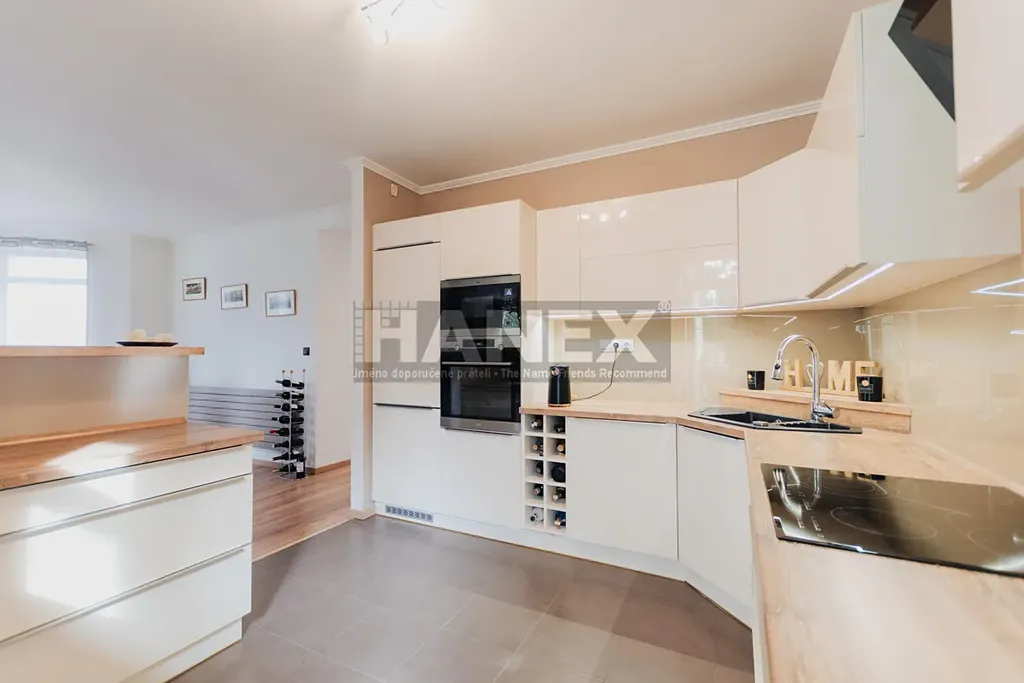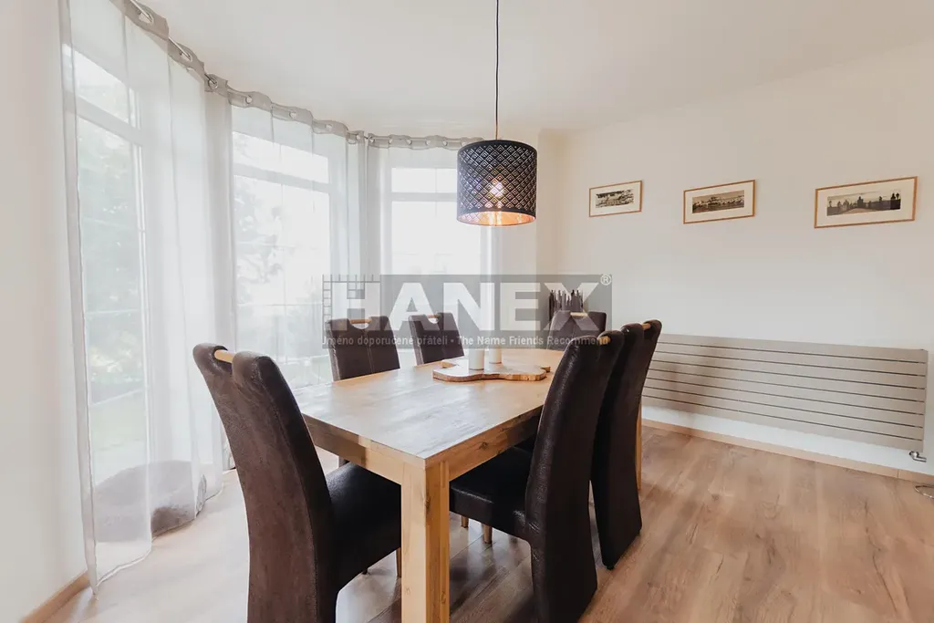 Kuchyň je moderní, plně vybavená a nabízí dostatek úložných prostor i přímý vstup na terasu. Praktický snídaňový pult odděluje kuchyň od jídelní části, kde se nachází jídelní stůl pro 8 osob. Obývací pokoj o velikosti 21 m2 je příjemným místem k relaxaci i setkávání s přáteli. Velká francouzská okna vedou na terasu, ideální pro grilování a letní posezení. Atmosféru dotváří rohová krbová kamna.