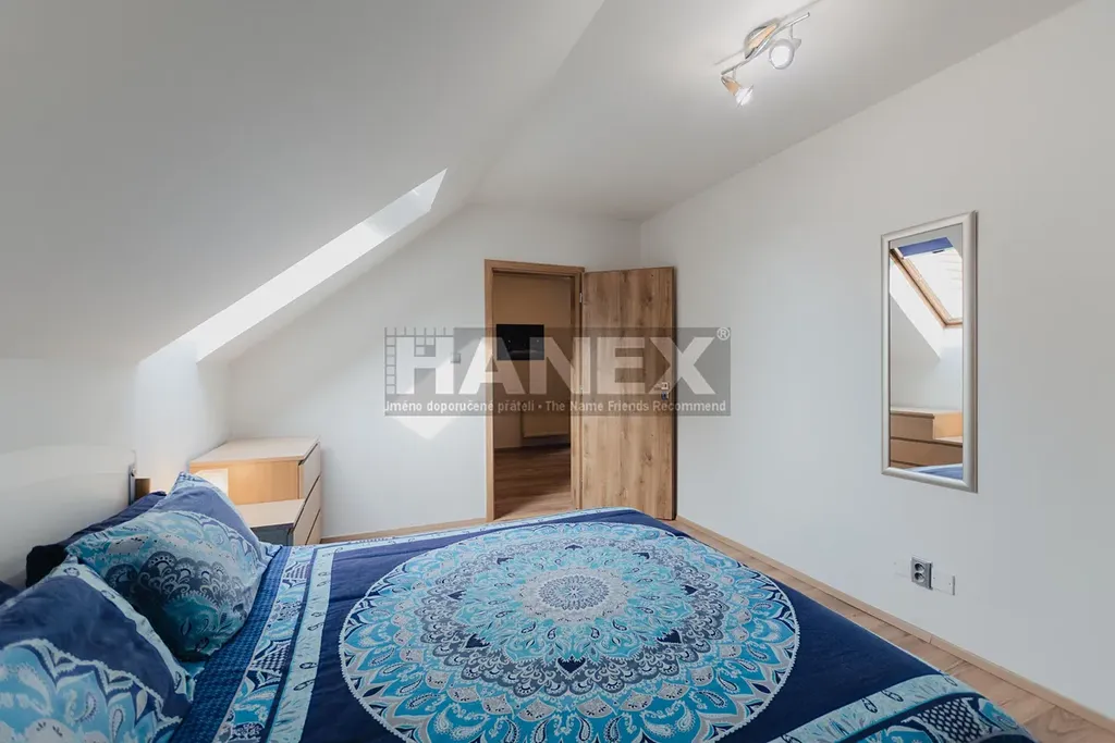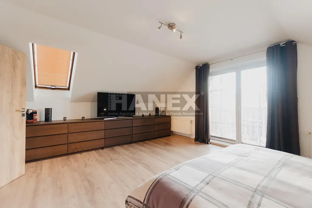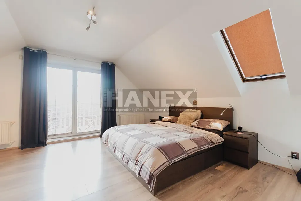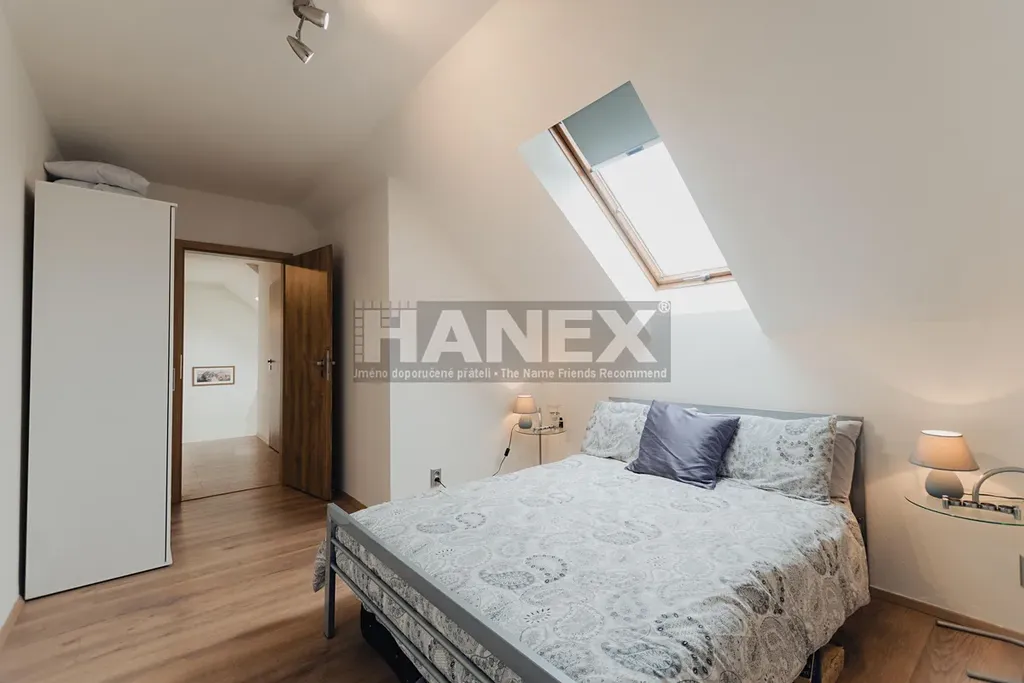 Dále jsou zde dvě ložnice o velikosti 10 m2 a 14 m2, které sdílejí balkon orientovaný na jih. Hlavní ložnice (24 m2) nabízí vlastní soukromý balkon s výhledem do zahrady. Hlavní koupelna je vybavena sprchovým koutem s masážní sprchou, vanou, dvojitým umyvadlem a WC. I tato koupelna má vlastní menší balkon.