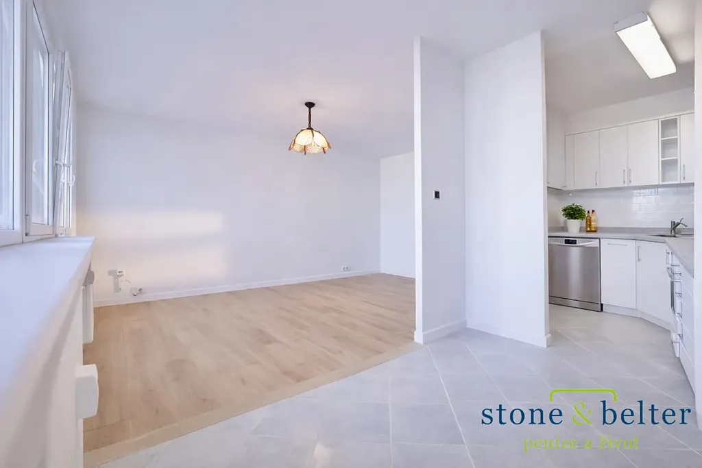 Dispozice bytu je praktická a funkční. Dominantou je prostorný obývací pokoj s kuchyňským koutem a přímým vstupem na velkou lodžii orientovanou na východ (cca 6 m²). Byt dále nabízí dva samostatné neprůchozí pokoje orientované na západ, koupelnu a samostatné WC. K dispozici jsou dvě lodžie – zasklená lodžie orientovaná na jih (cca 2,3 m²) a prostorná lodžie po celé délce obývacího pokoje na východ.