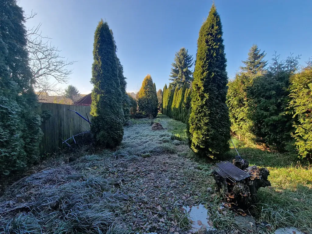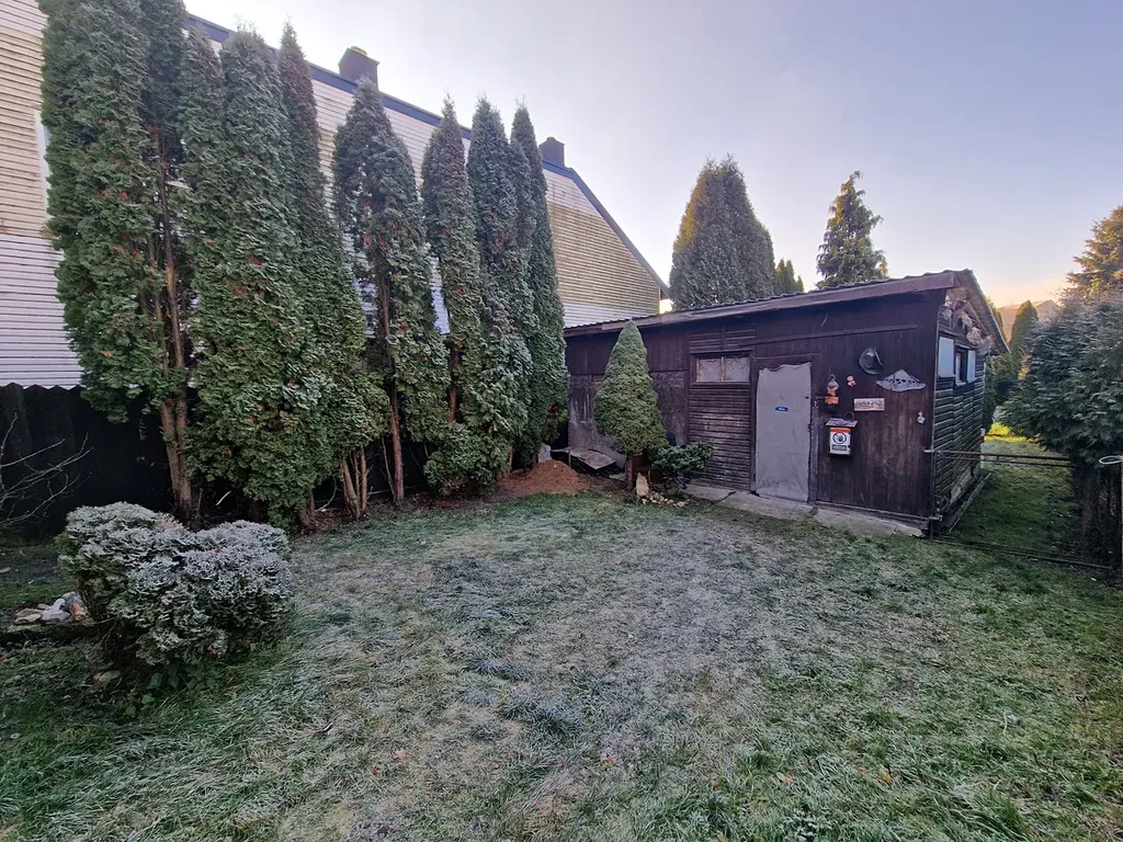 Za domem se nachází prostorná zahrada, se vzrostlými stromy. Na pozemku za domem instalována dřevěná kůlna, která je velmi zachovalá.