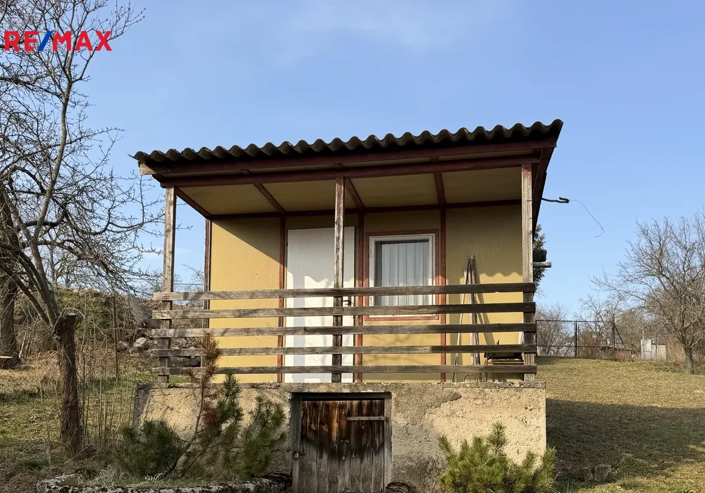 Součástí pozemku je menší rekreační chatka na betonovém základu, která je částečně podsklepená a nabízí praktické zázemí pro odpočinek nebo uskladnění zahradního nářadí a vybavení.