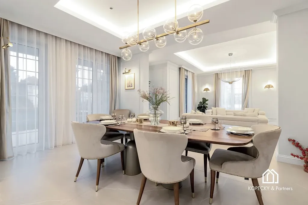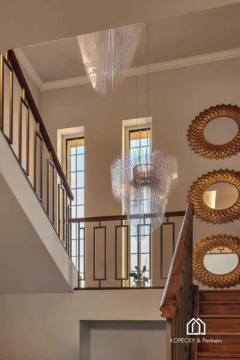 Celý dům je zařízen v duchu sofistikované elegance – od ikonických svítidel navržených Zahou Hadid, přes jídelní stůl Bonaldo pro deset hostů, až po nábytek a osvětlení od značek Eichholz, Moooi či Cattelan Italia. Každý detail byl pečlivě vybrán tak, aby tvořil harmonický celek.