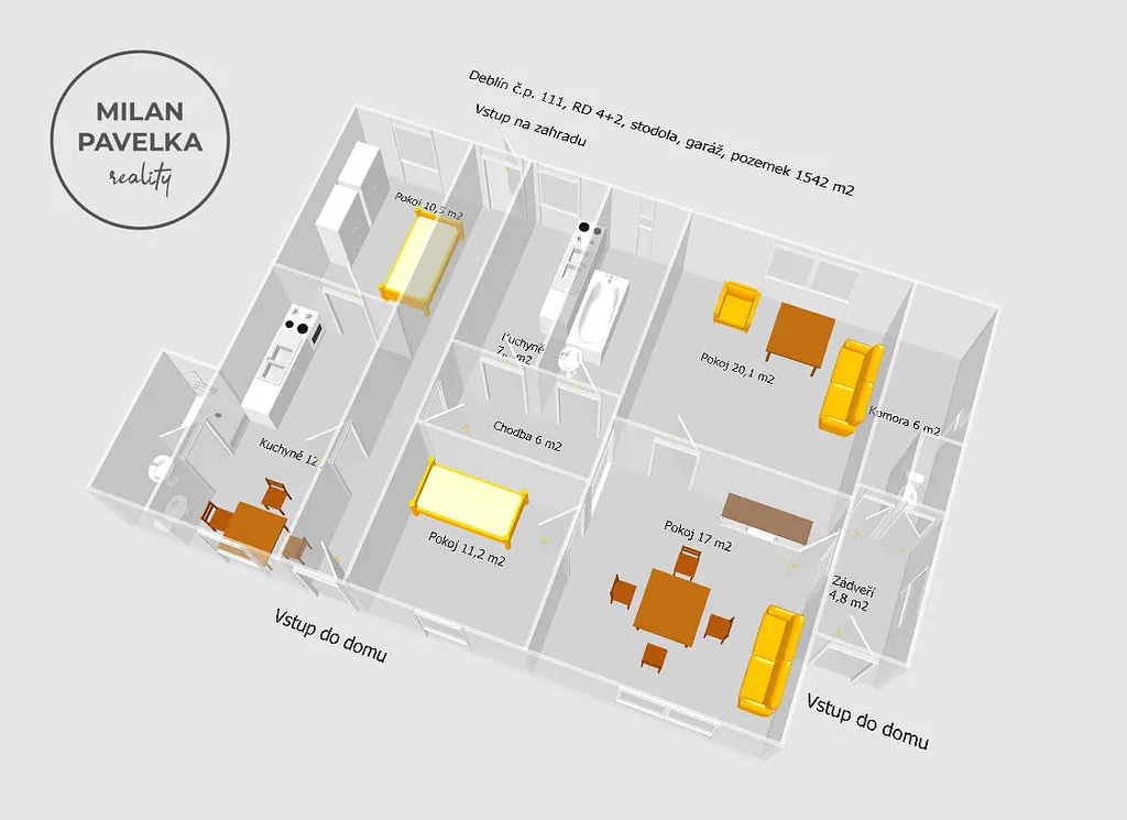 Celková plocha pozemku, který je svažitý na východní stranu má výměru 1542 m², zastavěná plocha domu je 180 m². Dispozice domu v půdorysu.