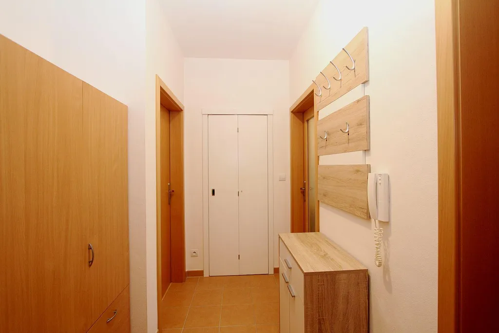 Součástí nájmu je kuchyňská linka s vestavěnými spotřebiči (sklokeramická varná deska, trouba, odsavač par, myčka nádobí, volně stojící lednička s mrazákem, policový systém v šatně, šatní skříň na chodbě.