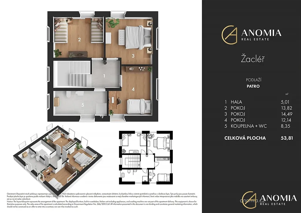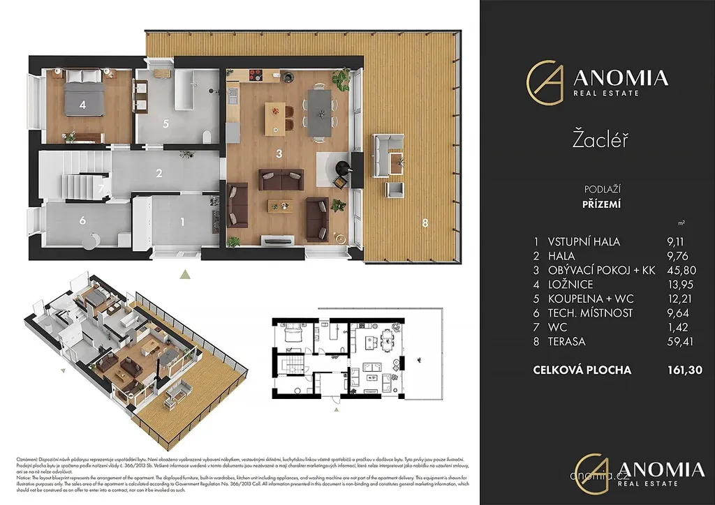 Dům má dispozici 5+kk (s podlahovou plochou 155,7m2) a kromě prostorné terasy o výměře 59,41m2 jsou velkou výhodou také dvě krytá parkovací stání a prostorná technická místnost (sklep) v přízemí (42,6m2), kterou lze v případě zájmu po drobné stavební úpravě využívat také jako garáž.