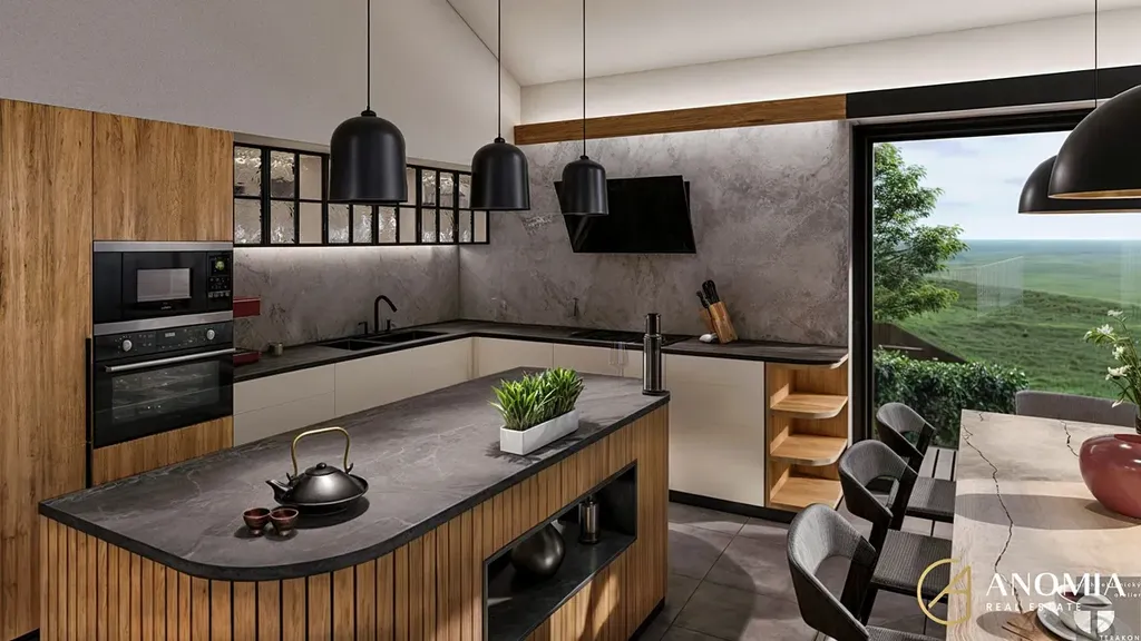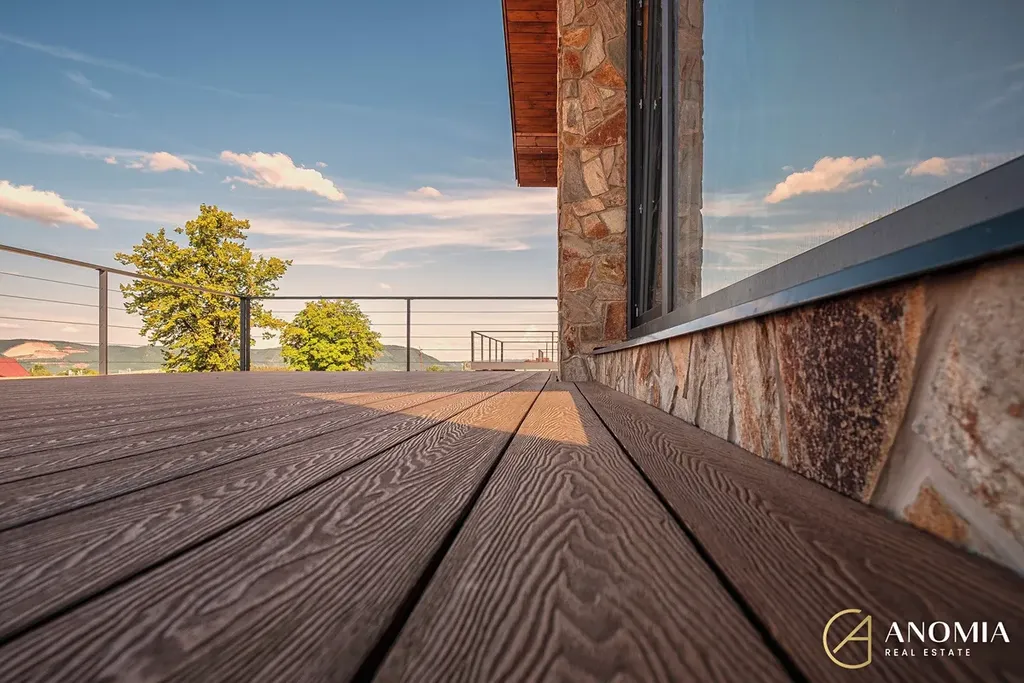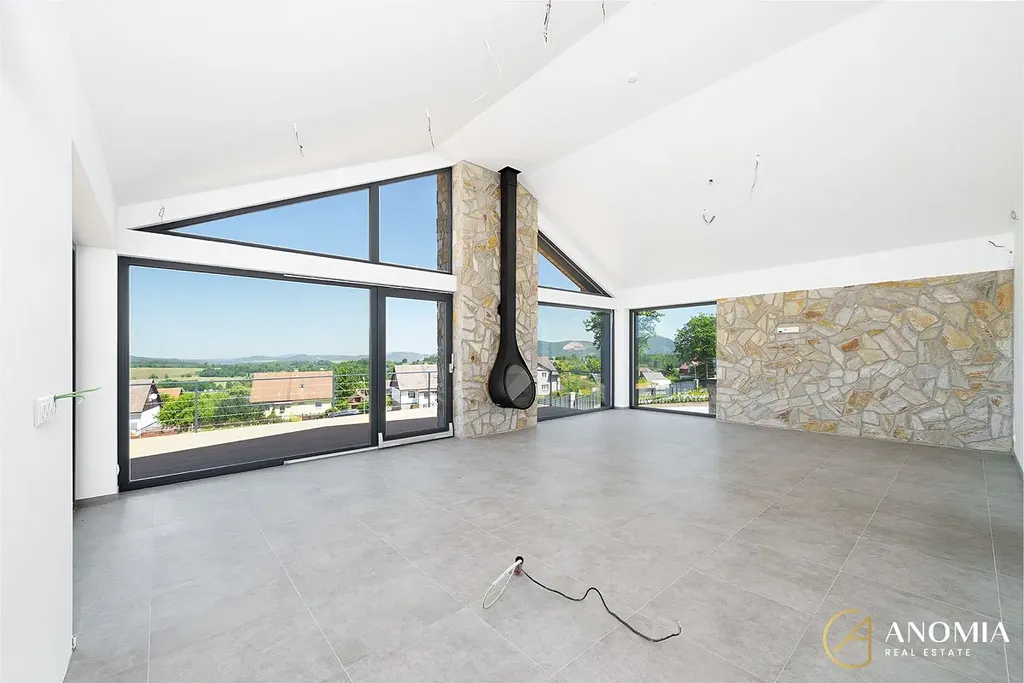 Hlavní obytný prostor, propojený s kuchyní a jídelnou, dominuje panoramatickým oknem s výhledem na Vraní Hory, který vám nabídne nezapomenutelnou atmosféru v každém ročním období. Vila dále disponuje čtyřmi samostatnými pokoji a dvěma koupelnami, které jsou zařízeny v nadčasovém designu (betonové stěrky na stěnách, podomítkové baterie Grohe, kvalitní obklady, kamenické rohy…). Z koupelny v přízemí je možný výstup na terasu a do zahrady, kde je možné si udělat bazén, či vlastní wellness. Díky krajnímu umístění parcely budete mít na pozemku maximum soukromí.