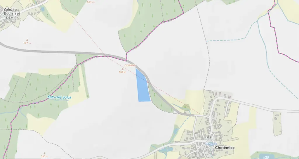 Strategická poloha: Pozemek se nachází přímo u hlavní silnice spojující obce Chotěmice a Záluží u Budislavě. Tato viditelnost a poloha zvyšují dlouhodobou tržní hodnotu parcely.