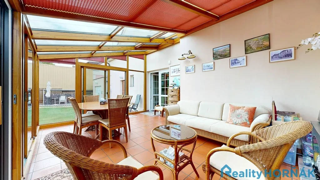 K severní straně domu přistavena zimní zahrada (23 m²) v luxusním provedení (exotické dřevo, stínící systém, sítě proti hmyzu, klimatizace, ratanový nábytek), poskytující nečekaně těsný kontakt s venkovní přírodou.