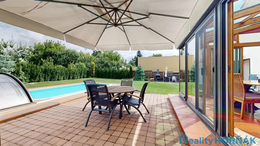 V nevelké zahradě zabudován bazén 6 x 3 m se slanou vodou a protiproudem, zastřešený antiUV moduly, přelivový, vyhřívaný čerpadlem, pochozí plocha z materiálu Piedra. Užívání vhodné zpravidla květen – září.