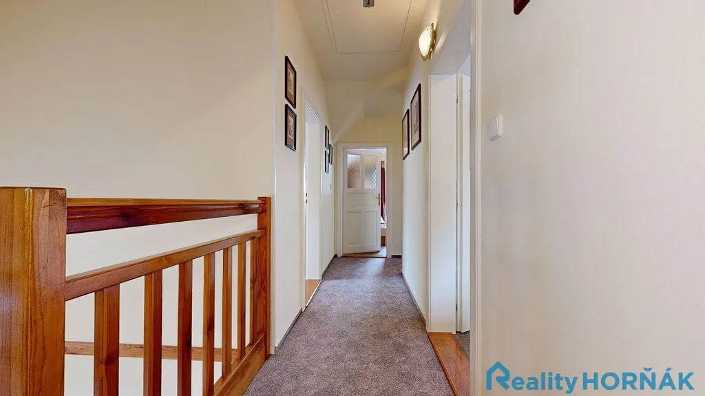 Dispozice domu: zčásti podsklepený dvěma místnostmi (celkem 24 m2), vhodnými i pro umístění pračky, sušičky, lednice apod. Přízemí o rozloze 80 m2 tvoří zádveří 4 m2, hala 10 m2, koupelna se sprchovým koutem a s WC vč. pisoáru 4 m2, kuchyně s jídelnou 20 m2 a obývací pokoj s krbem 42 m2. V patře po dřevěném schodišti se zábradlím jsou chodba 8 m2, čtyři pokoje (21 m2 , další tři po 13 m2), koupelna s vanou a WC vč. bidetu (6 m2) a balkon (4 m2). Obytná plocha domu činí 154 m2. Podkroví resp. půda (podlaha OSB desky) umožňuje uložení velkého množství momentálně nepotřebných věcí.