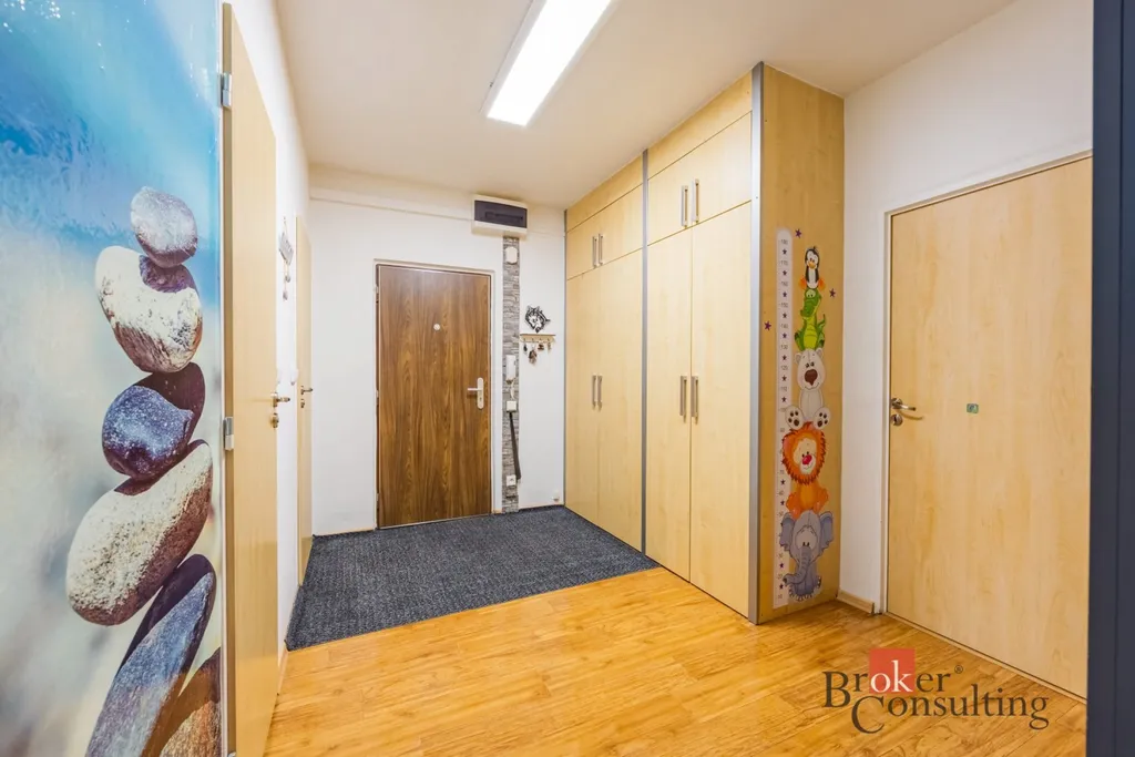 Dalšími místnostmi jsou komfortní ložnice a samostatný dětský pokoj, které poskytují dostatek soukromí i prostoru. Byt dále disponuje velkou vstupní chodbou, která působí velmi vzdušně a nabízí možnosti pro další úložné řešení. Praktickým bonusem je také komora, která zajišťuje další místo pro ukládání věcí.