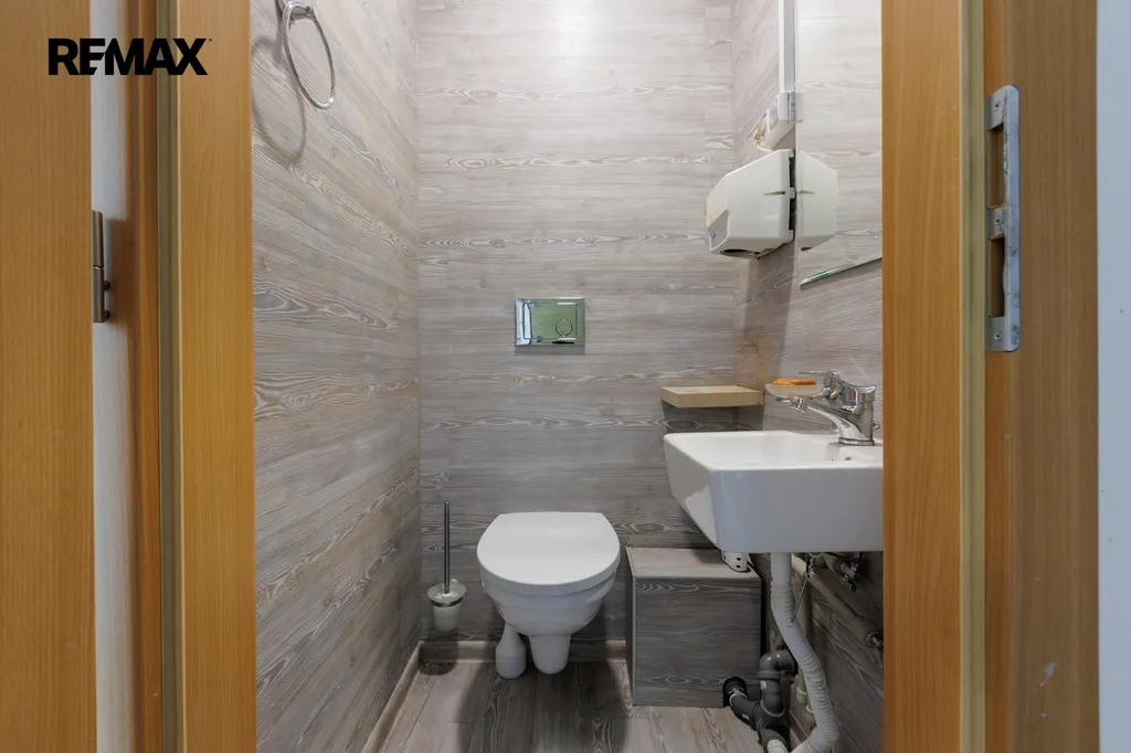 Velkou výhodou je, že prostory jsou částečně vybaveny. K dispozici je kuchyňská linka, základní kancelářský nábytek, vestavěné skříňky na míru s moderním LED podsvícením, regály, pracovní stoly a komoda. Součástí je také praktická úklidová místnost a samostatné WC.