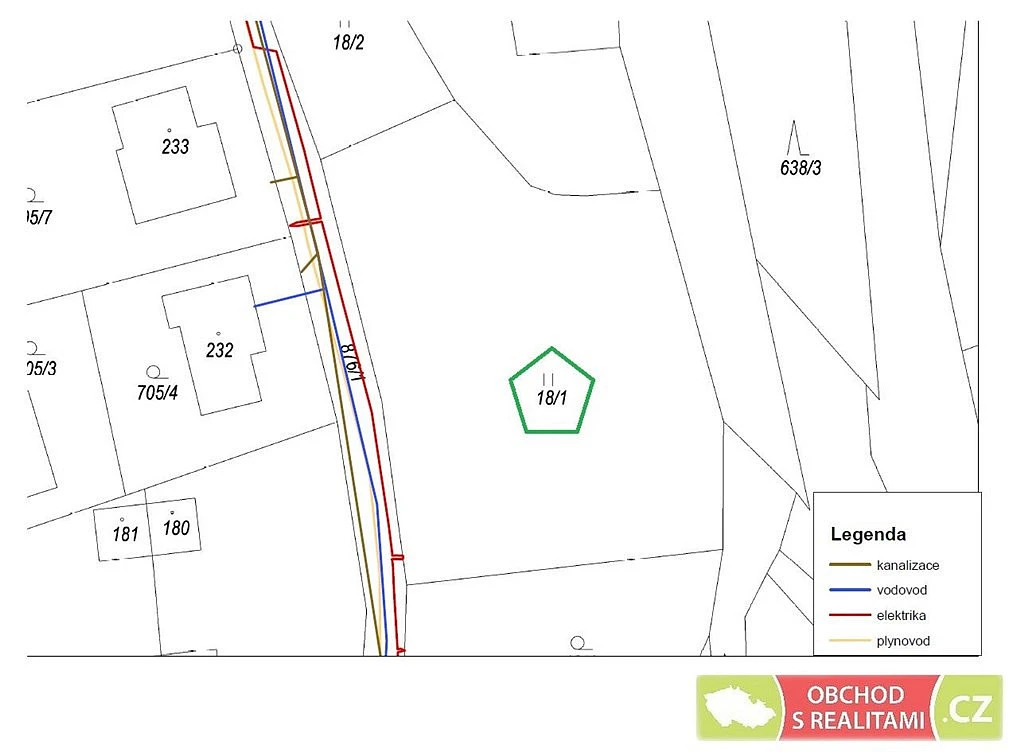 Pozemek je přístupný po obecní asfaltové komunikaci, ve které leží vodovod, kanalizace i plyn; přípojka elektřiny je zakončena v pilíři na pozemku.