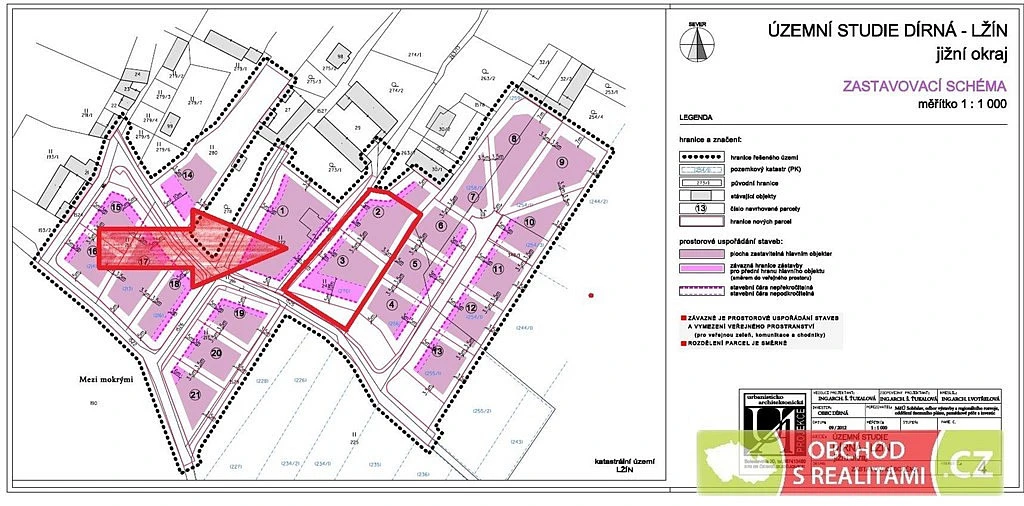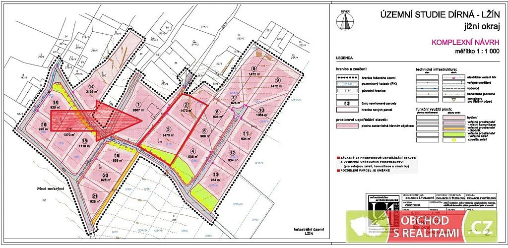 Pozemek je součástí zpracované územní studie. Tato studie připouští rozdělení pozemku na dvě stavební parcely, dále je ze studie dobře patrná případná další parcelace přilehlých pozemků, kupující tak má dobrou představu o možném budoucím využití pozemků v těsné blízkosti.