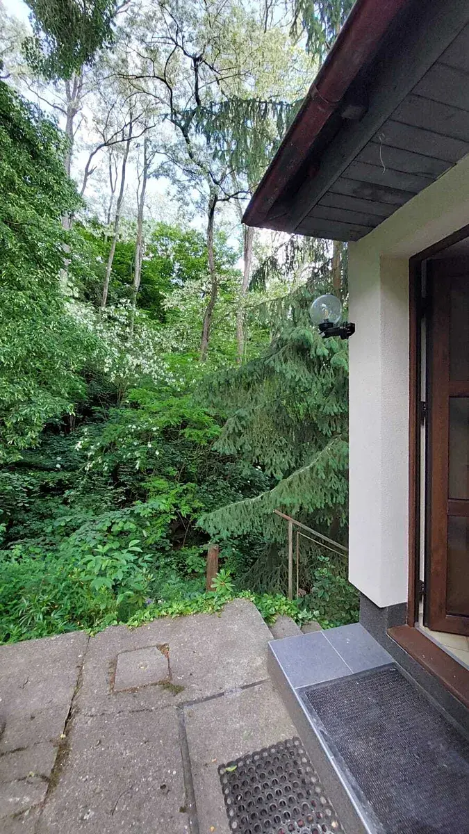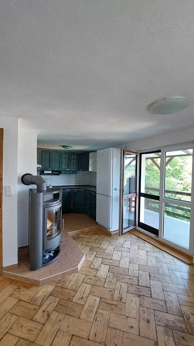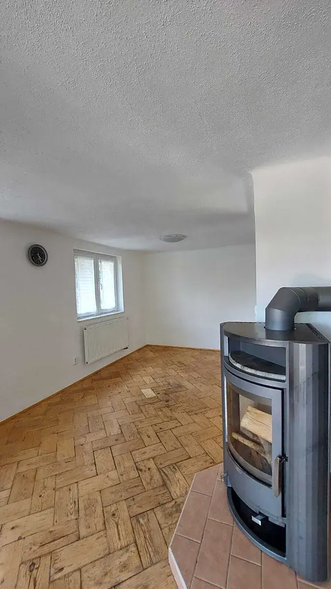 V přízemí najdete prosvětlený obývací pokoj s kuchyňským koutem (vybavená kuchyňská linka , krbová kamna) a zastřešeným balkonem s překrásným výhledem..