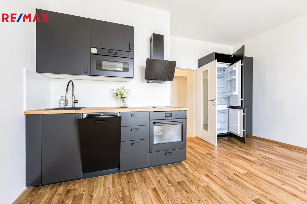 Kuchyňská linka je plně vybavena – indukční dvouplotýnkou, vestavnou troubou, digestoří, myčkou a kombinovanou lednicí s mrazákem.