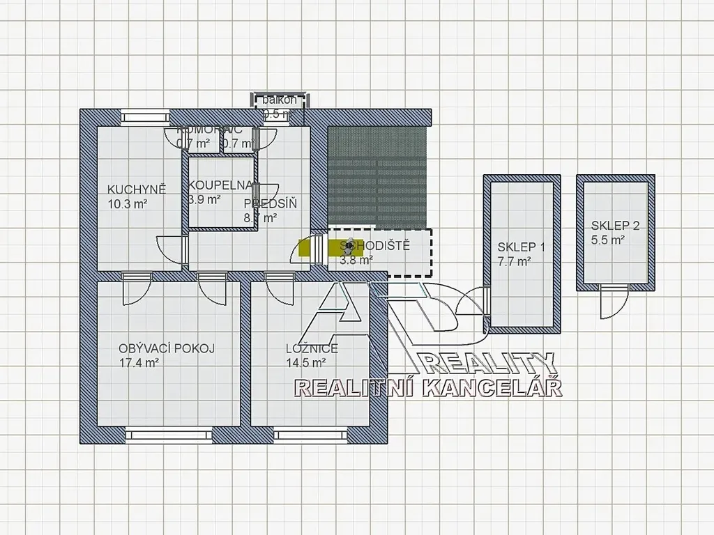 Dispozice bytu: obývací pokoj [17,4m2], pokoj – ložnice [14,2m2], kuchyně [10m2], prostorná předsíň [8,8m2], koupelna [3,8m2] a WC [0,9m2], komora – spíž [0,7m2]. Z předsíně je přístupný malý balkon [0,5m2]. K bytu jsou k dispozici dva sklepy v 1.PP (suterén) domu o výměře [5,3m2] a [7,5m2]. Topení v bytě ústřední (plynový kotel ÚT), podružné měření spotřeby studené vody (vodoměr), samostatné měření spotřeby elektřiny (elektroměr) a zemního plynu (plynoměr). V bytě je možnost připojení internetu a STA.