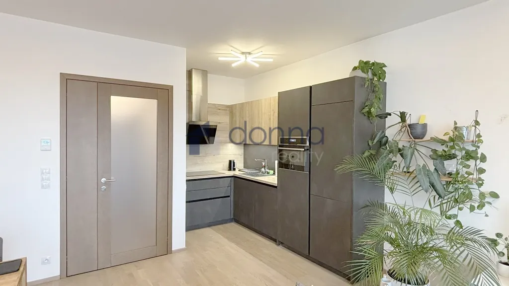 Obývací pokoj s kuchyňskou linkou, ložnicí, koupelnou a komorou. Kuchyňská linka s vestavěnými spotřebiči včetně myčky, indukční desky, kombinované trouby a lednice s mrazákem.