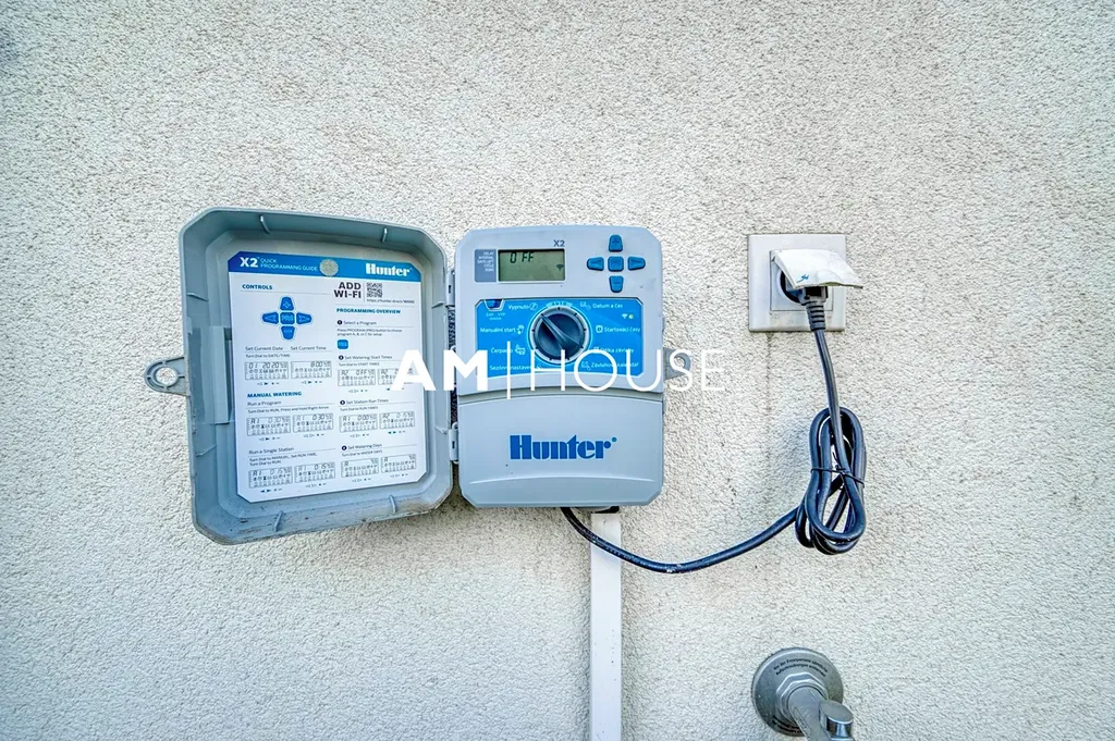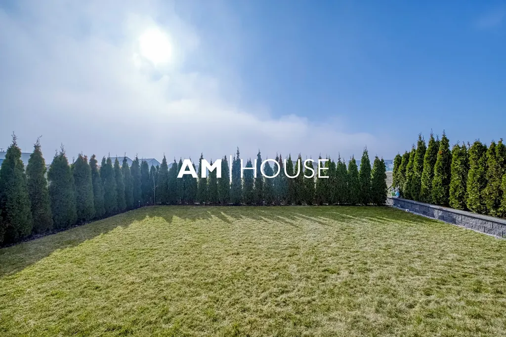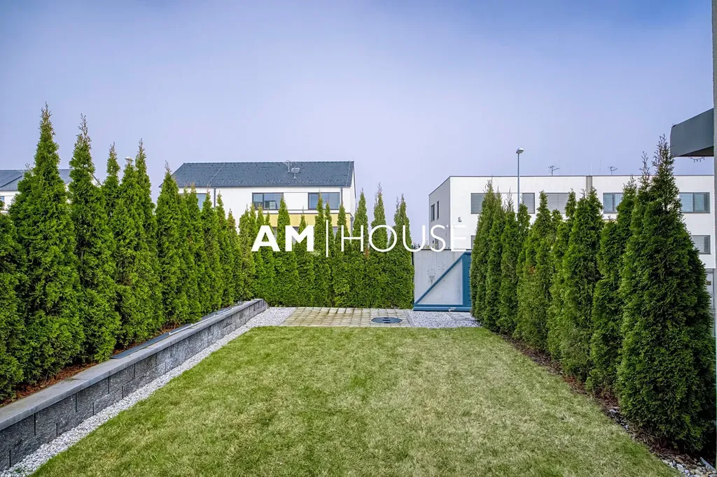 Zahrada kolem domu byla navržena s důrazem na soukromí a snadnou údržbu. Nachází se zde rolovaný trávník, výsadba přibližně 125 tújí, které vytvářejí přirozené soukromí, a automatický zavlažovací systém rozdělený do čtyř zón – jedna zóna pro túje a tři zóny pro trávník. Systém je napojen na samostatný vodoměr určený pro závlahu, zatímco druhý vodoměr slouží pro potřeby domu.
