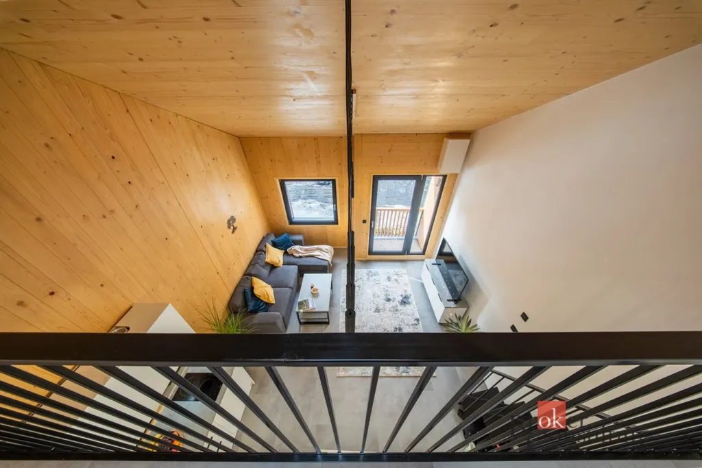 Apartmán o dispozici 2+kk má celkovou plochu 66 m² + balkon (1,5 m²) a díky loftovému řešení působí velmi vzdušně a moderně. Dispozice je navržena tak, aby pohodlně ubytovala až čtyři osoby. Otevřený obytný prostor propojuje kuchyň, jídelní část i relaxační zónu a vytváří příjemné místo pro odpočinek po dni stráveném v horách.