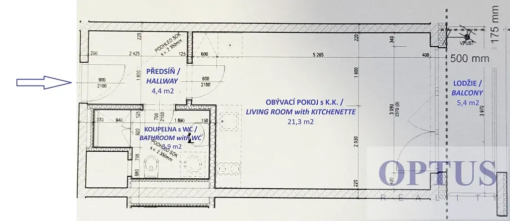 Byt tvoří pokoj o velikosti 21,3 m2 s plně vybaveným kuchyňským koutem a se vstupem na lodžii, dále koupelna (se sprchovým koutem + WC) a předsíň.
