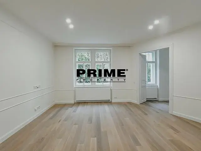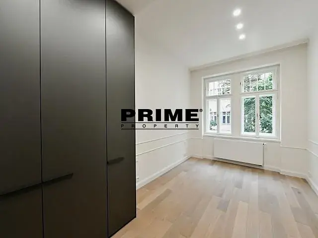 Nedávno kompletně zrekonstruovaný, 2 ložnicový (+ pracovna / malá ložnice), klimatizovaný, nezařízený (nebo po dohodě zařízený za vyšší nájem) byt s 1 koupelnou k pronájmu, 4+kk, 118m2, s malým balkonem (2m2) a garážovým stáním, situovaný v 1. patře kompletně zrekonstruovaného secesního domu s výtahem.