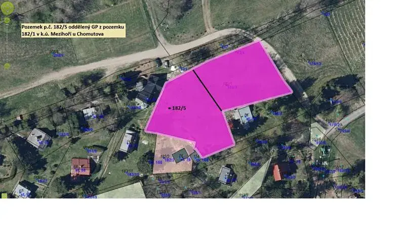 Prodej pozemku p.č. 182/5 druhem pozemku ostatní plocha o výměře 1 106 m2 v k.ú. Mezihoří u Chomutova, oddělený geometrickým plánem z pozemku p.č. 182/1 v k.ú. Mezihoří u Chomutova.