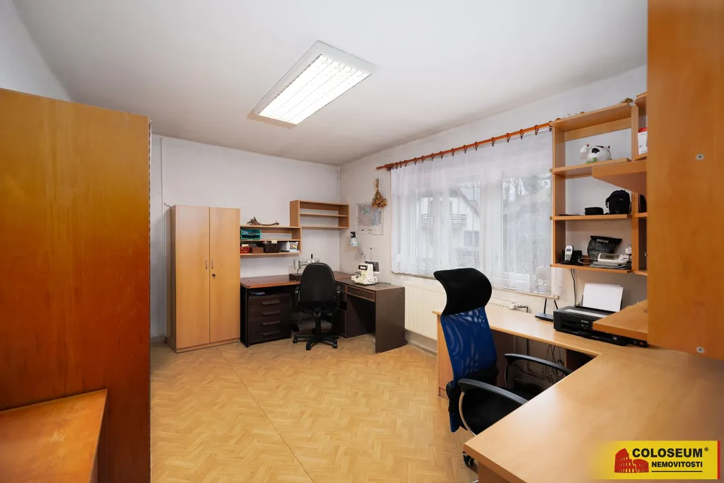 Přízemí: prostorný obývací pokoj spojený s kuchyňským koutem a jídelnou, pracovna, šatna, koupelna a samostatné WC.