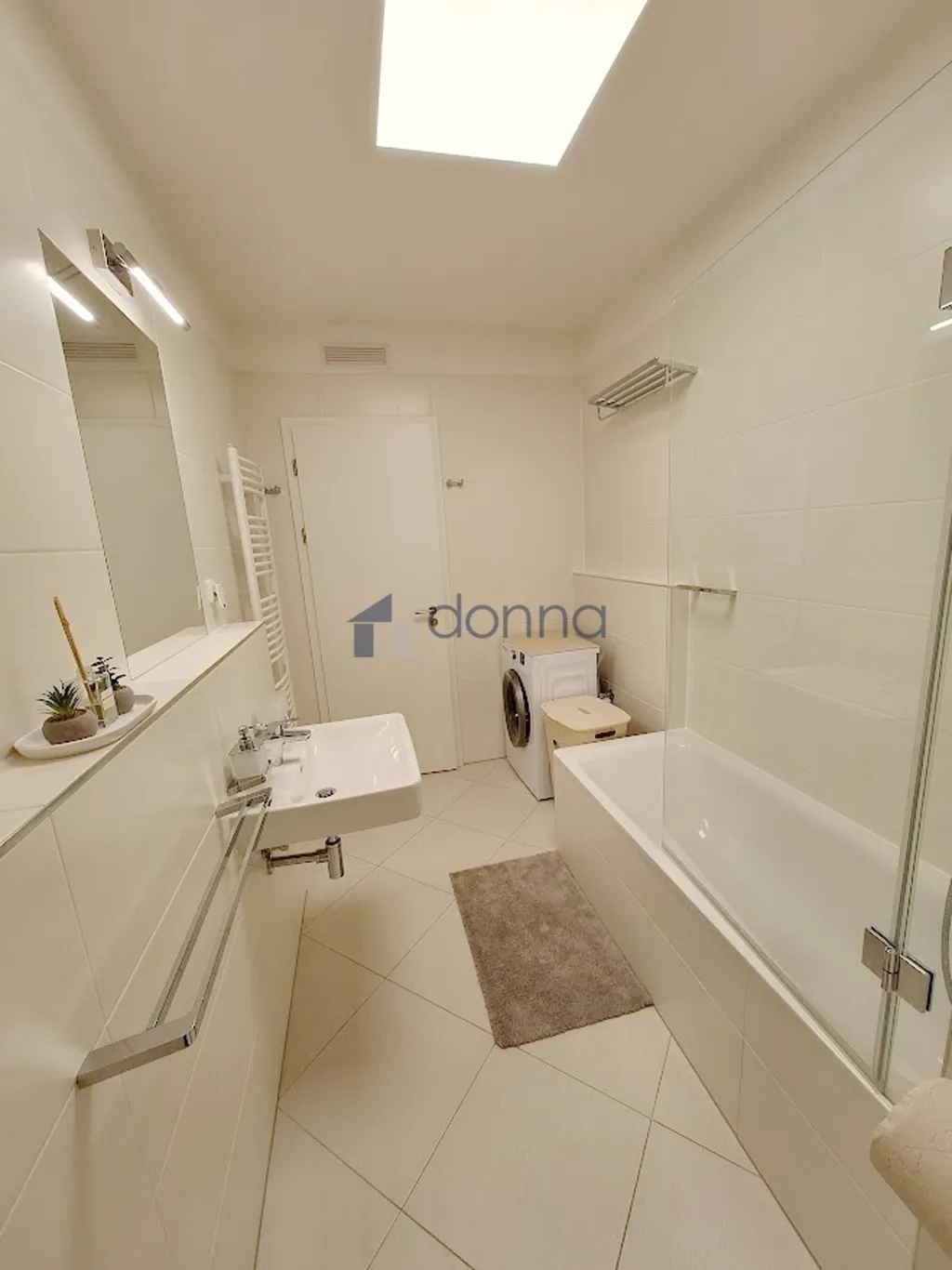 Koupelna s vanou, pračkou a toaletou.