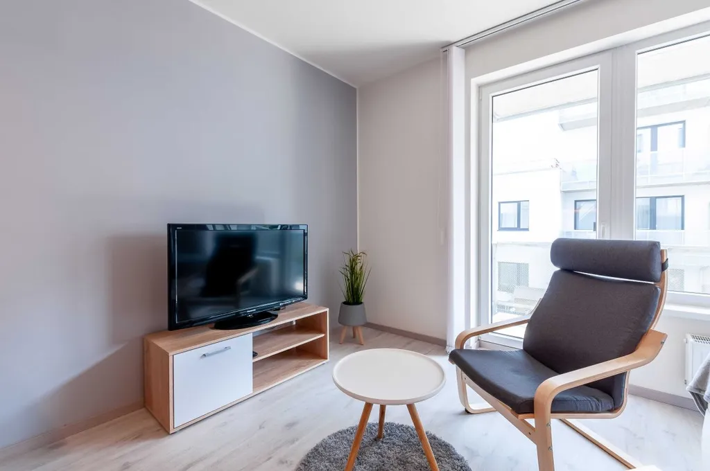 Byt se nabízí vybavený. Moderní kuchyně je zařízená kuchyňskou linkou s vestavěnou elektrickou troubou, sklokeramickou deskou, digestoří, myčkou a lednicí. Součástí kuchyně je jídelní stůl se židlemi. Obývací část je zařízena postelí, úložnou komodou, televizním stolkem, televizí a křeslem. V předsíni najdeme velmi prostornou vestavěnou skříň. Nadstandardní koupelna disponuje sprchový koutem, umyvadlem a toaletou.