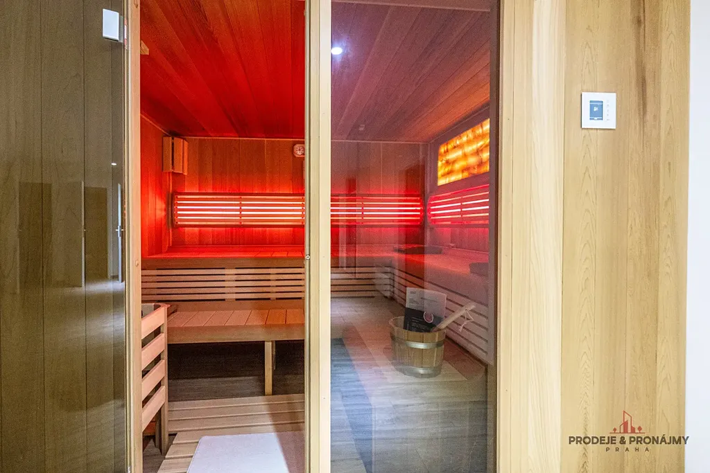 Ve sníženém přízemí, ke kterému vede shcodiště z bytu, se nachází sauna pro 6 osob a wellness zóna.