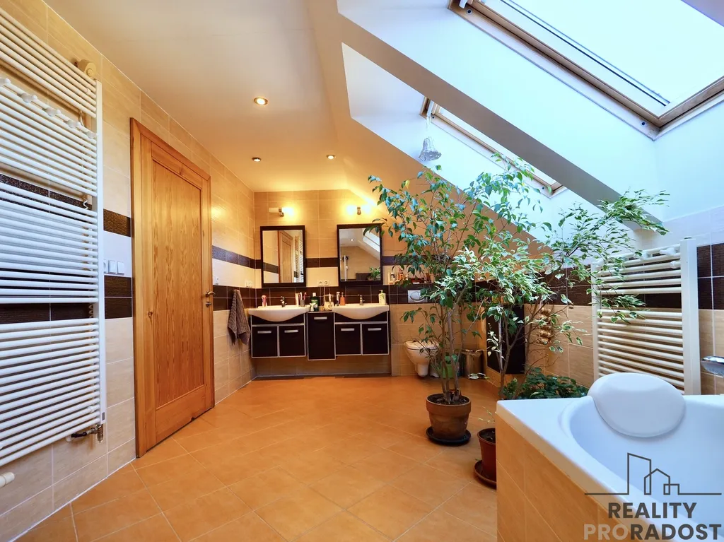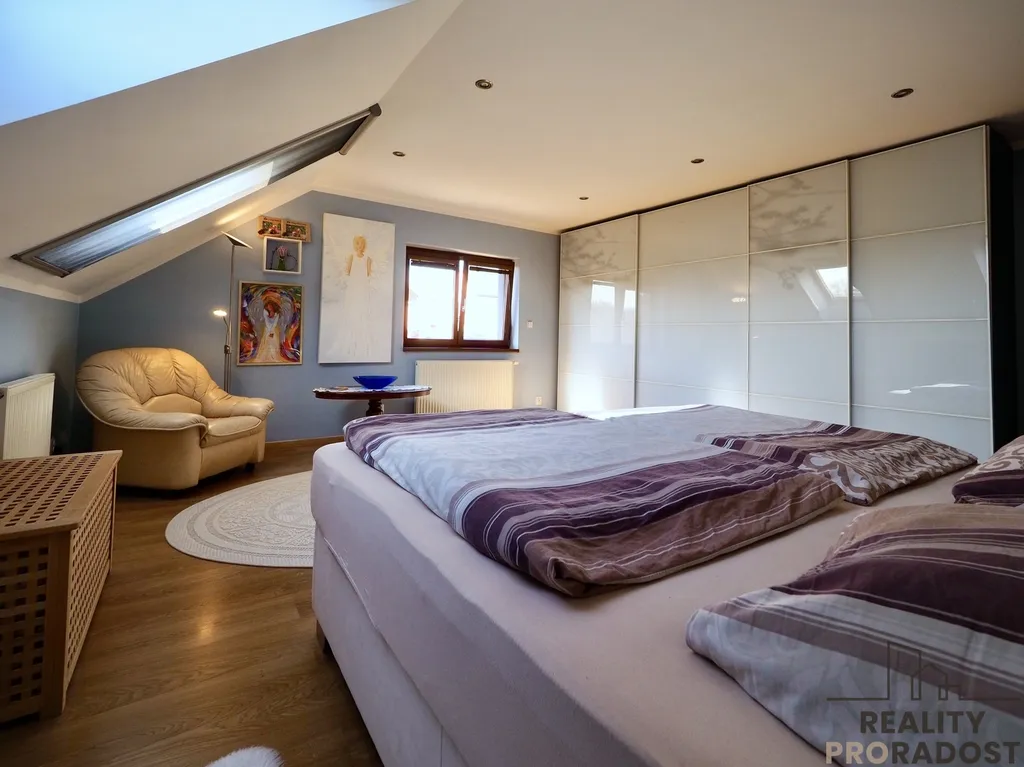 Součástí domu je i velká garáž 62m2 s elektrickými vraty a vstupem i ze zahrady.
