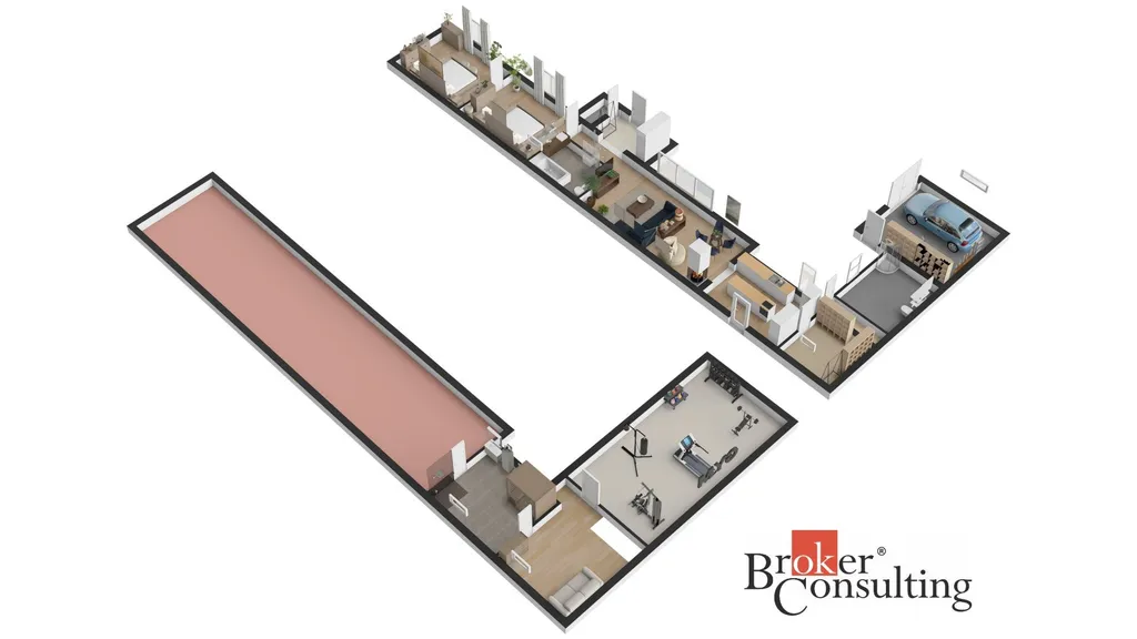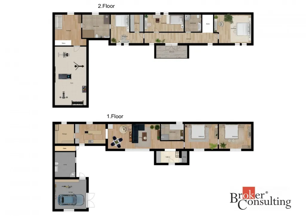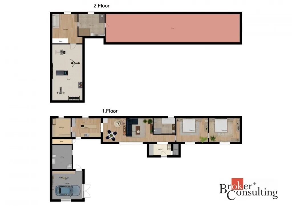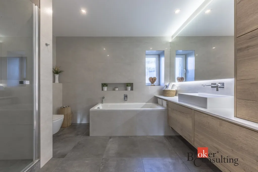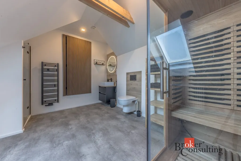 Dispozice domu: na přízemí se nachází vstupní hala, koupelna s vanou, sprchovým koutem, toaletou s umyvadlem, dvěma ložnicemi, kde každá disponuje prostornou vestavnou šatní skříní. Světlý obývací pokoj s jídelnou je útulný i díky krbovým kamnům, navazující kuchyň umožňuje propojení s obývacím pokojem, je zde i prostorný špajz. Z kuchyně je přímý vstup na terásku za domem, kde lze ráno ráno posnídat. Hlavní venkovní sezení je situované u obývacího pokoje v zahradě. Samostatně přístupná technická místnost, která slouží i jako prádelna, s pračkou a se sušičkou je hned vedle garáže (22 m2). Do patra se dostaneme po točitých schodech, tuto část majitelé využívají pro relaxaci. Najdeme zde velkou koupelnu s toaletou, se sprchovým koutem, saunou, odpočívárnu a prostornou pracovnu s fitness koutem.